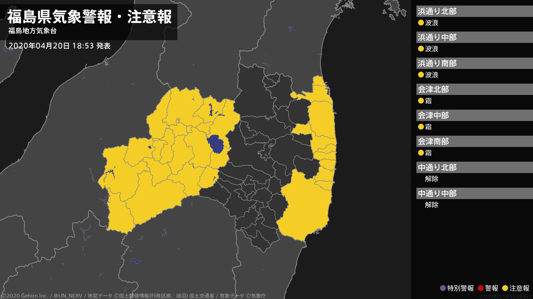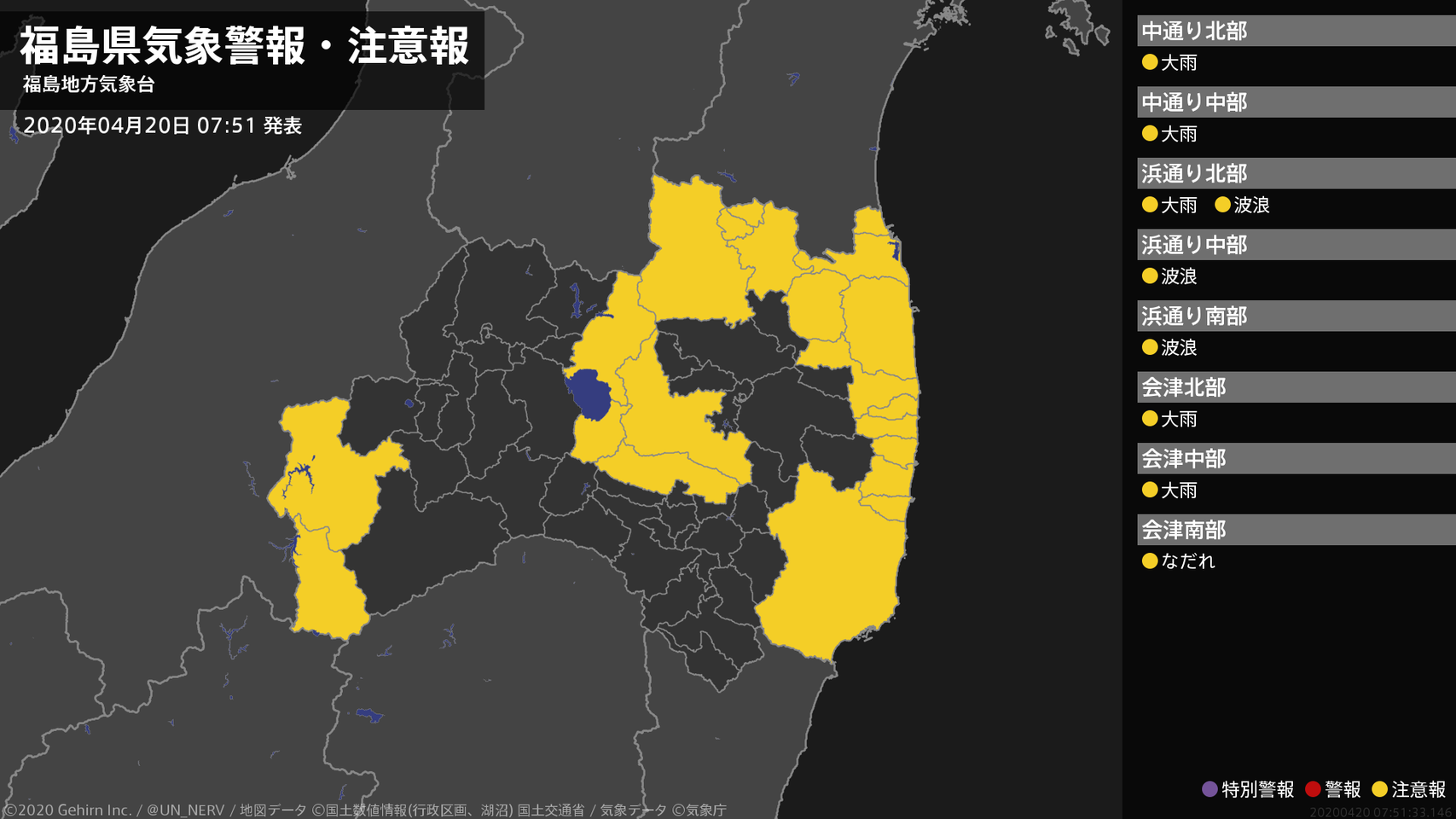 【福島県 気象警報・注意報 2020年04月20日 07:51】福島県では、20日夕方まで土砂災害に、20日夜遅くまで高波に注意してください。会津では、ここしばらくなだれに注意してください。#気象警報注意報 #福島県