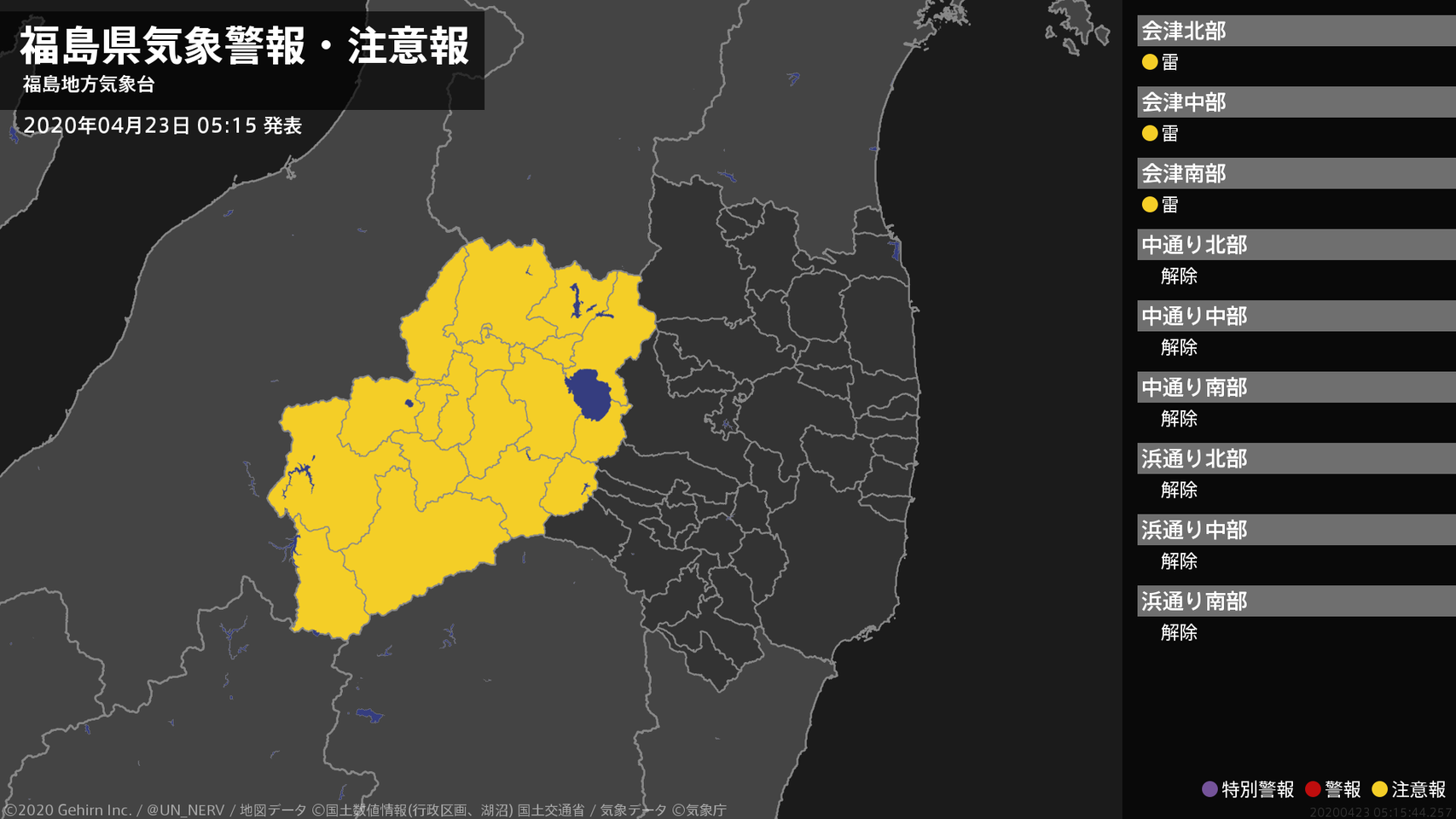 【福島県 気象警報・注意報 2020年04月23日 05:15】会津では、23日昼前から23日夕方まで急な強い雨や落雷に注意してください。#気象警報注意報 #福島県
