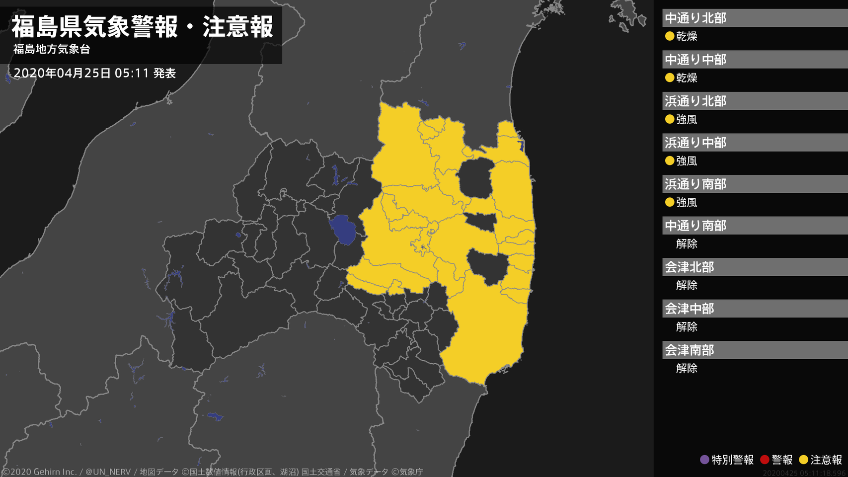 【福島県 気象警報・注意報 2020年04月25日 05:11】浜通りでは、25日昼過ぎから26日明け方まで強風に注意してください。中通りでは、26日まで空気の乾燥した状態が続くため、火の取り扱いに注意してください。#気象警報注意報 #福島県