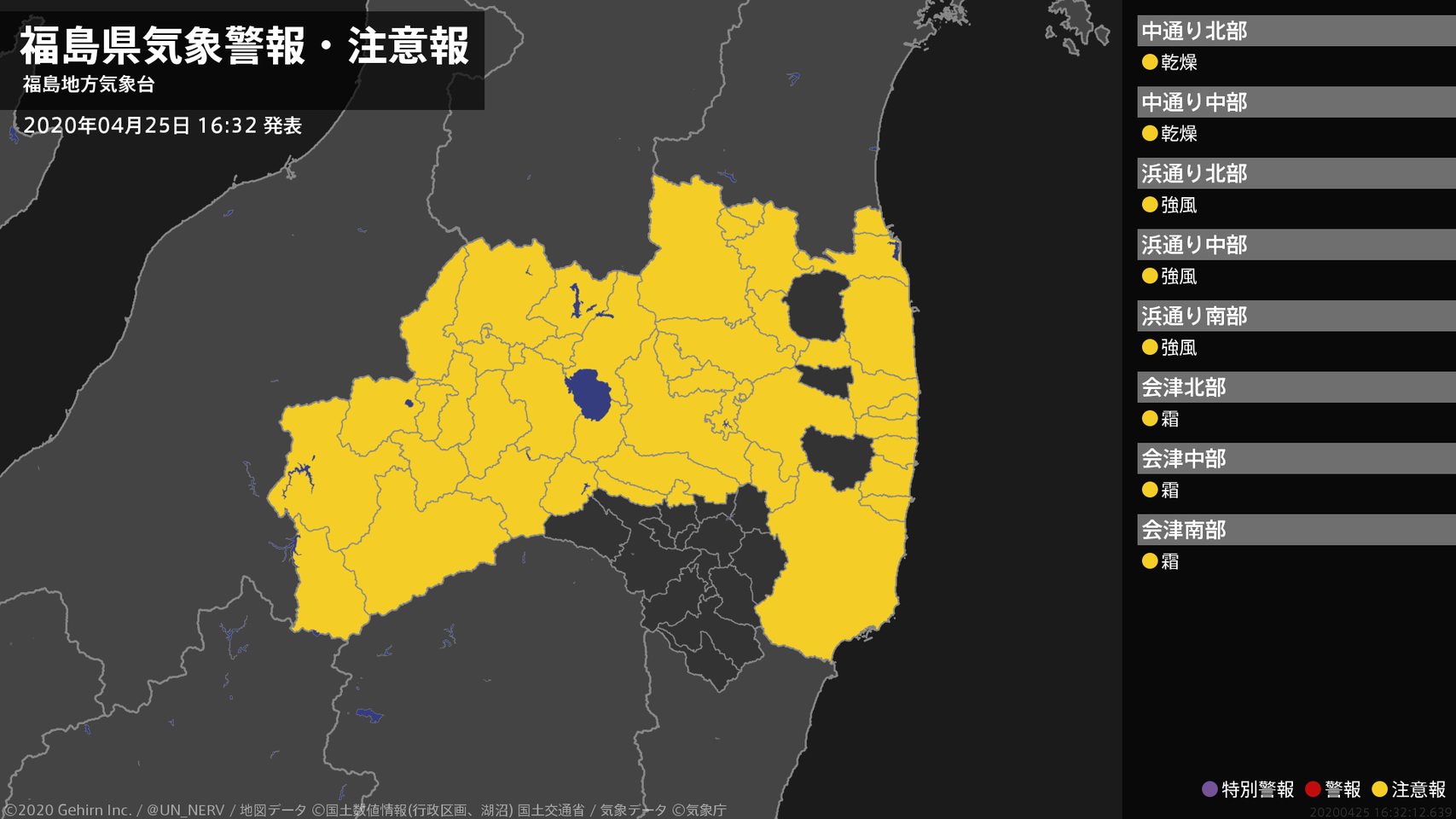 【福島県 気象警報・注意報 2020年04月25日 16:32】浜通りでは、強風に注意してください。中通りでは、空気の乾燥した状態が続くため、火の取り扱いに注意してください。会津では、霜に対する農作物の管理に注意してください。#気象警報注意報 #福島県