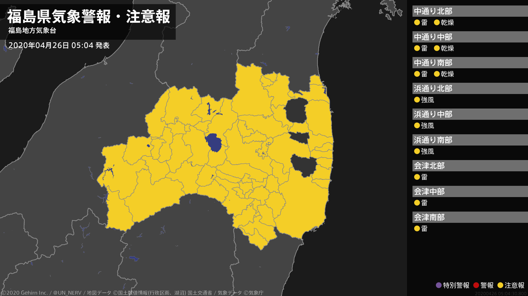 【福島県 気象警報・注意報 2020年04月26日 05:04】浜通りでは、強風に注意してください。中通り、会津では、急な強い雨や落雷に注意してください。中通りでは、空気の乾燥した状態が続くため、火の取り扱いに注意してください。#気象警報注意報 #福島県