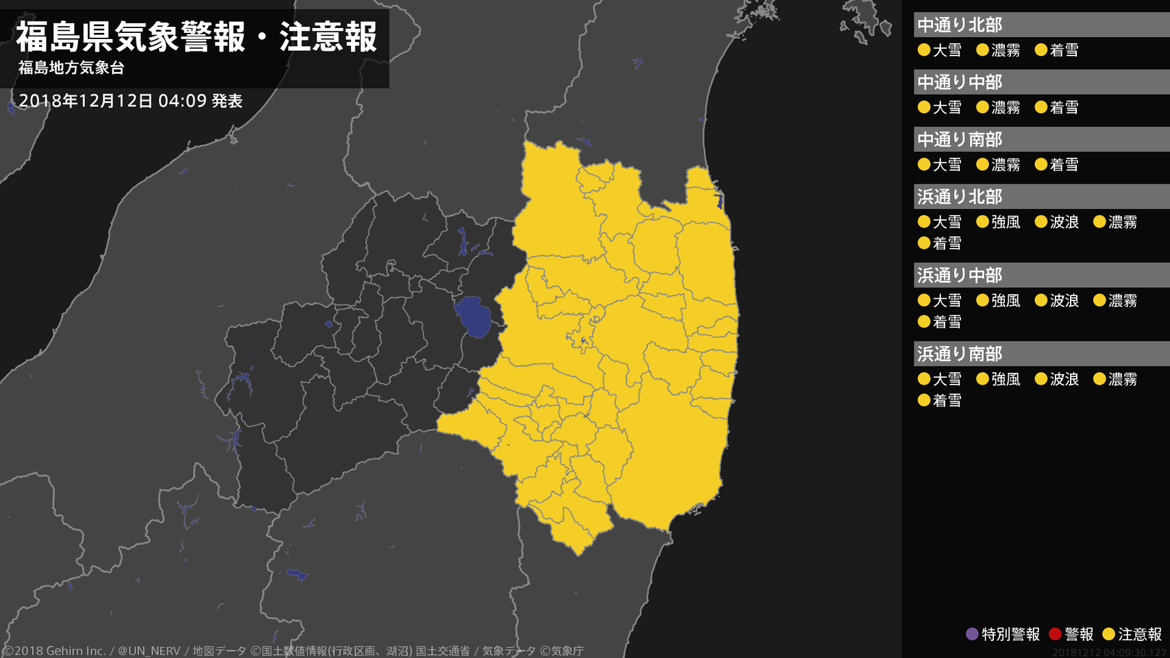 【福島県 気象警報・注意報 2018年12月12日 08:12】中通り、浜通りでは、強風や濃霧による視程障害に注意してください。浜通りでは、高波に注意してください。#気象警報注意報 #福島県