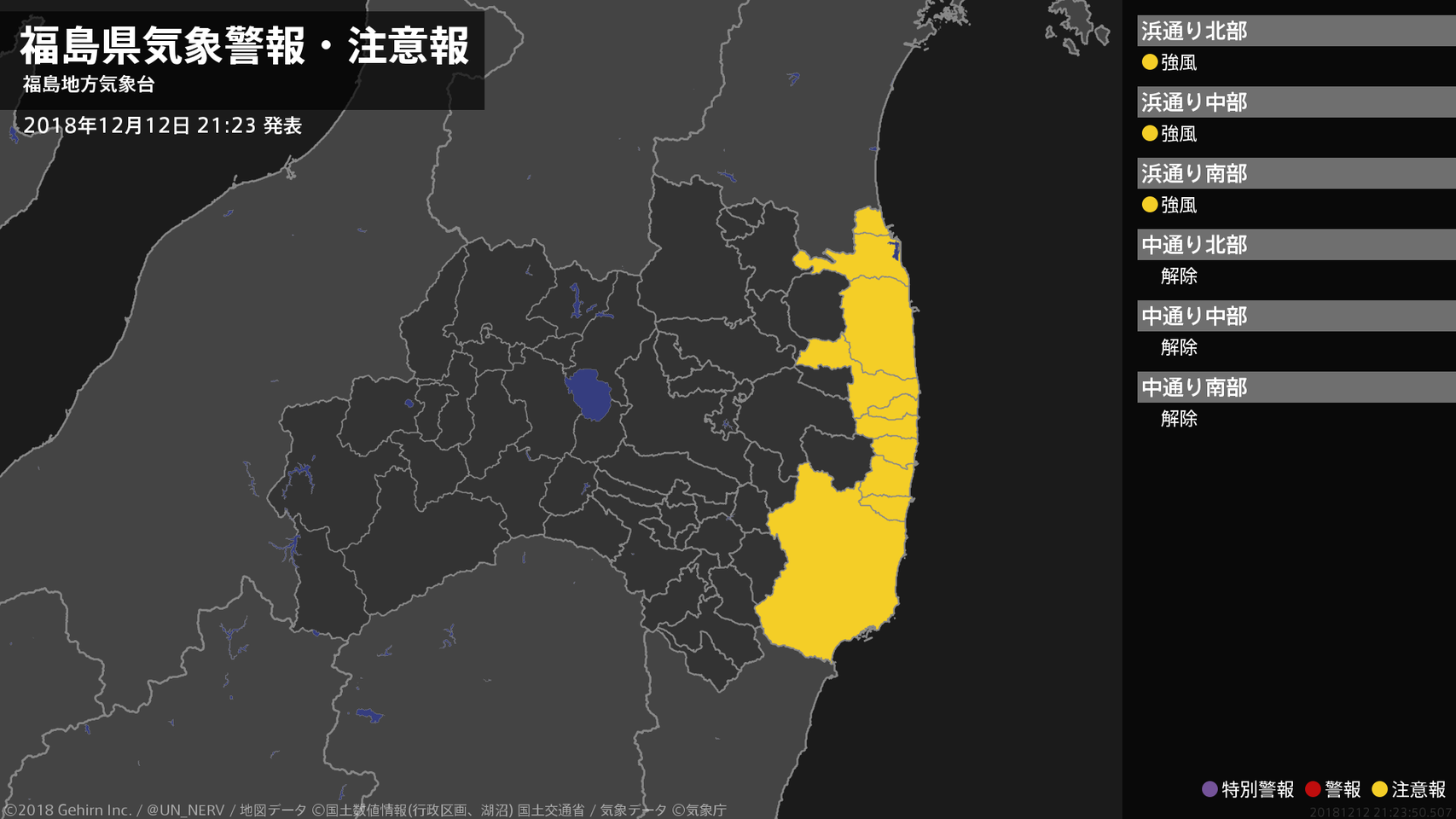 【福島県 気象警報・注意報 2018年12月12日 21:23】浜通りでは、13日明け方まで強風に注意してください。#気象警報注意報 #福島県