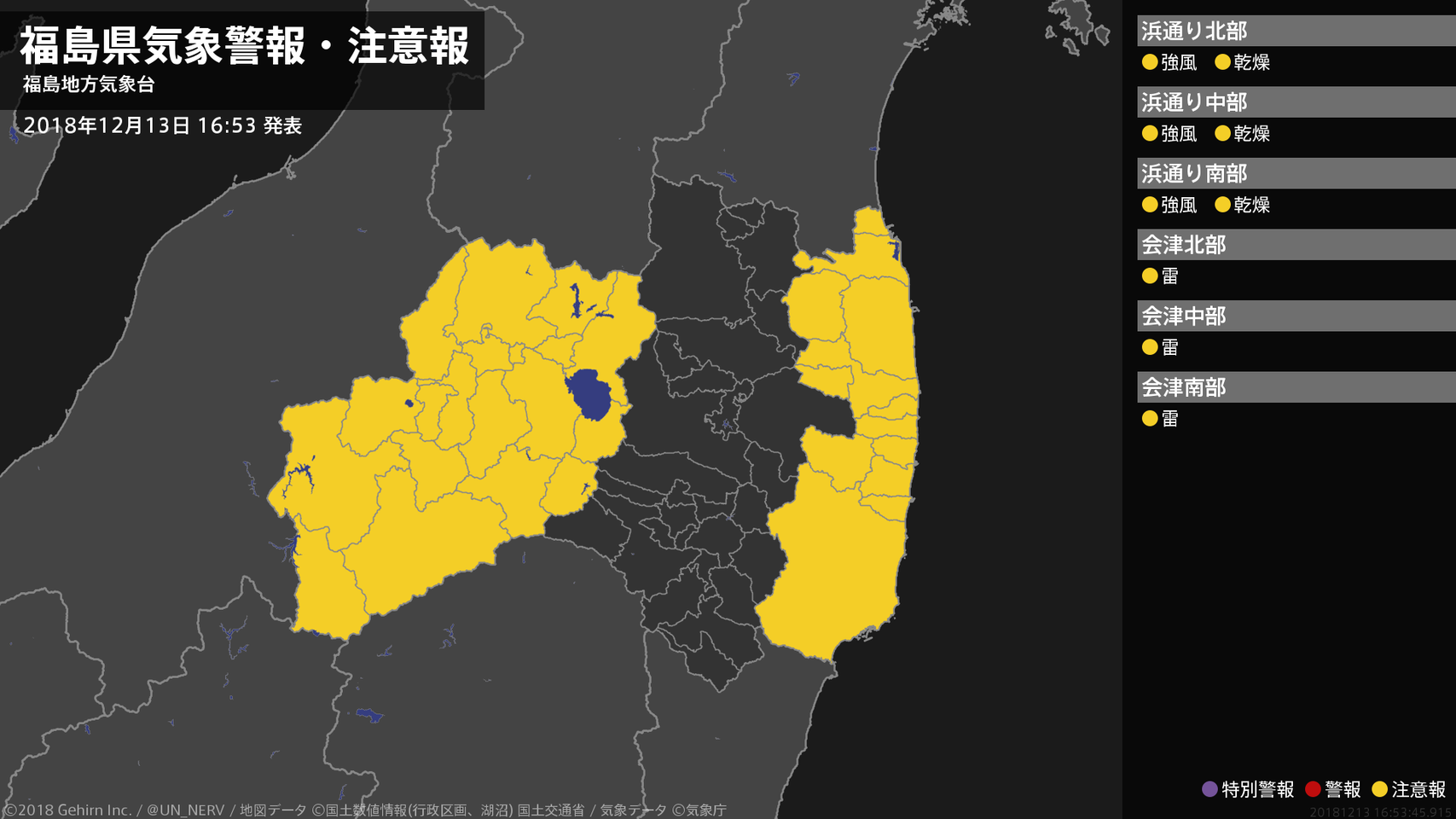 【福島県 気象警報・注意報 2018年12月13日 01:24】中通り、浜通りでは、13日明け方まで強風に注意してください。#気象警報注意報 #福島県