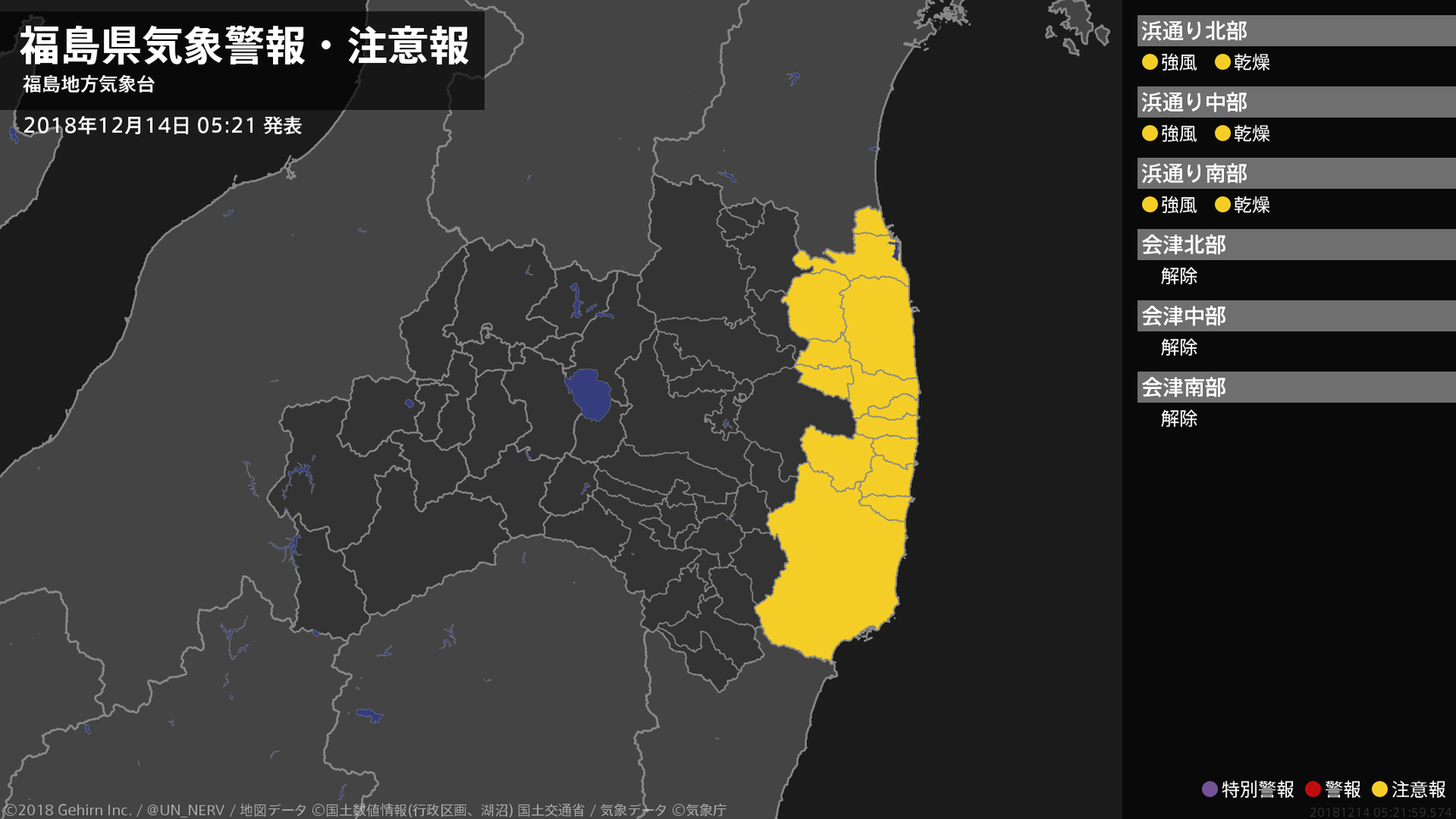【福島県 気象警報・注意報 2018年12月14日 05:22】浜通りでは、14日夜遅くまで強風に、16日まで空気の乾燥による火の取り扱いに注意してください。#気象警報注意報 #福島県