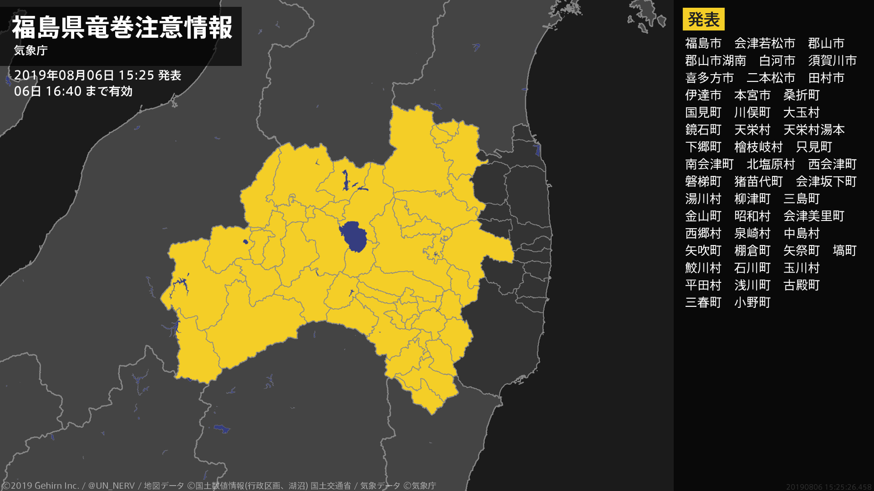 【福島県 土砂災害警戒情報 2019年08月06日 16:58】福島県に発表されていた土砂災害警戒情報はすべて解除されました。#土砂災害警戒情報 #福島県