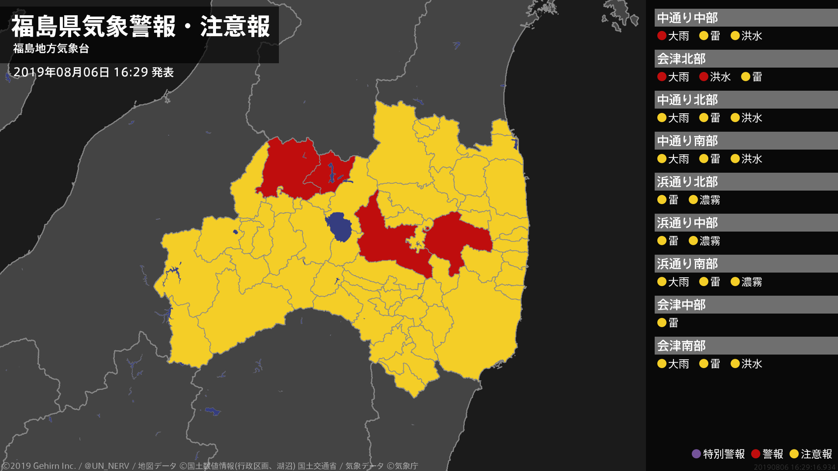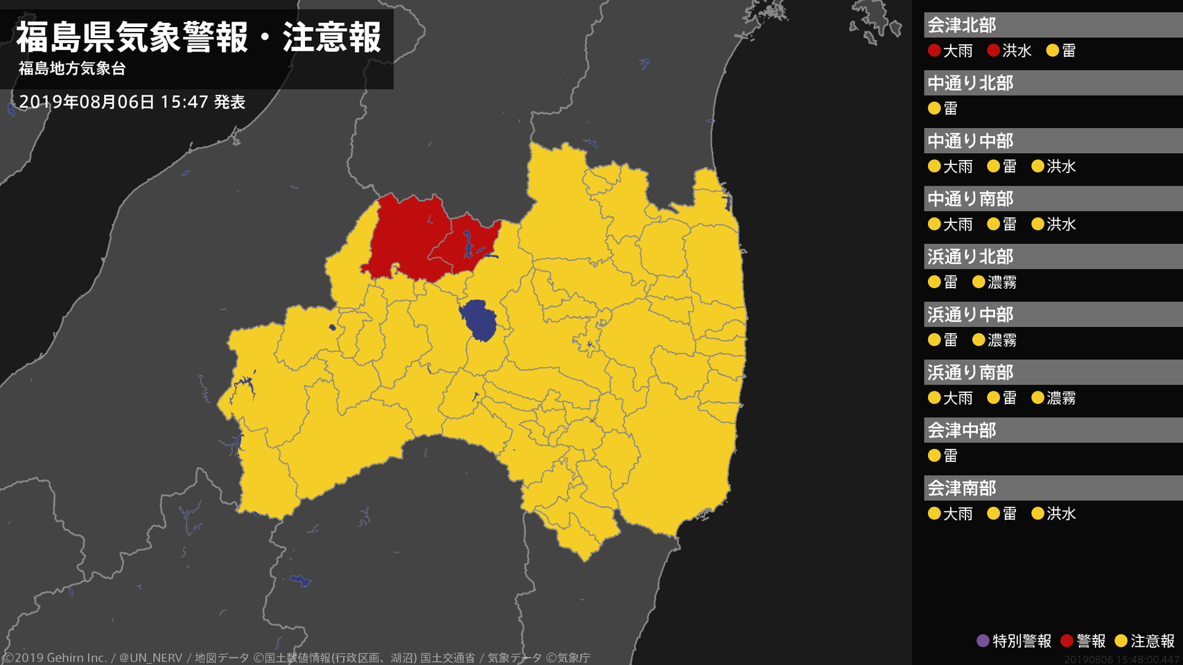 【福島県 気象警報 2019年08月06日 16:57】会津では、土砂災害に警戒してください。中通り、会津では、低い土地の浸水や河川の増水に警戒してください。#気象警報 #気象警報注意報 #福島県