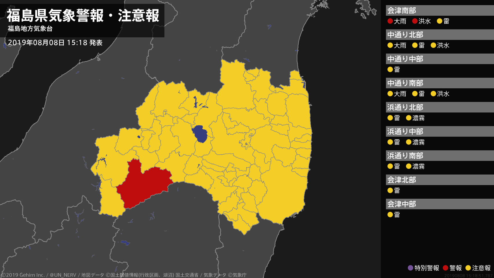 【福島県 気象警報(解除) 2019年08月08日 15:57】福島県に発表されていた気象警報はすべて解除されました。#気象警報 #福島県