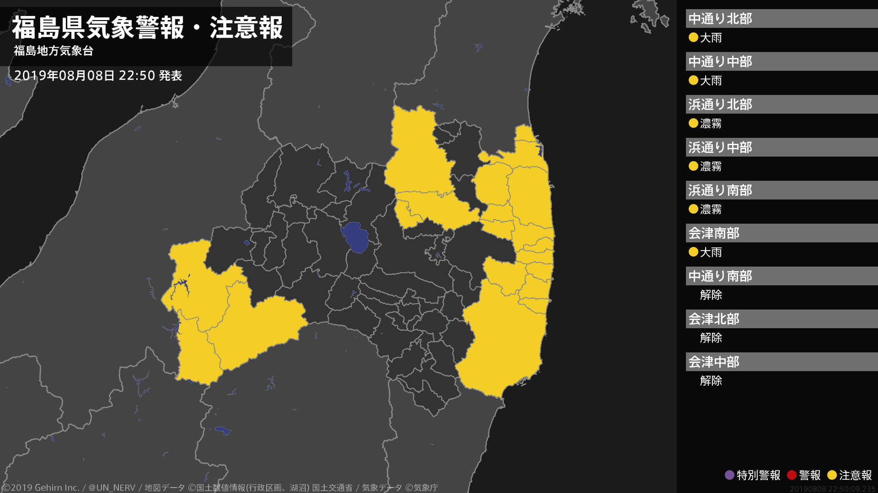 【福島県 気象警報・注意報 2019年08月08日 22:50】中通り、会津では、9日明け方まで土砂災害に注意してください。浜通りでは、9日昼前まで濃霧による視程障害に注意してください。#気象警報注意報 #福島県