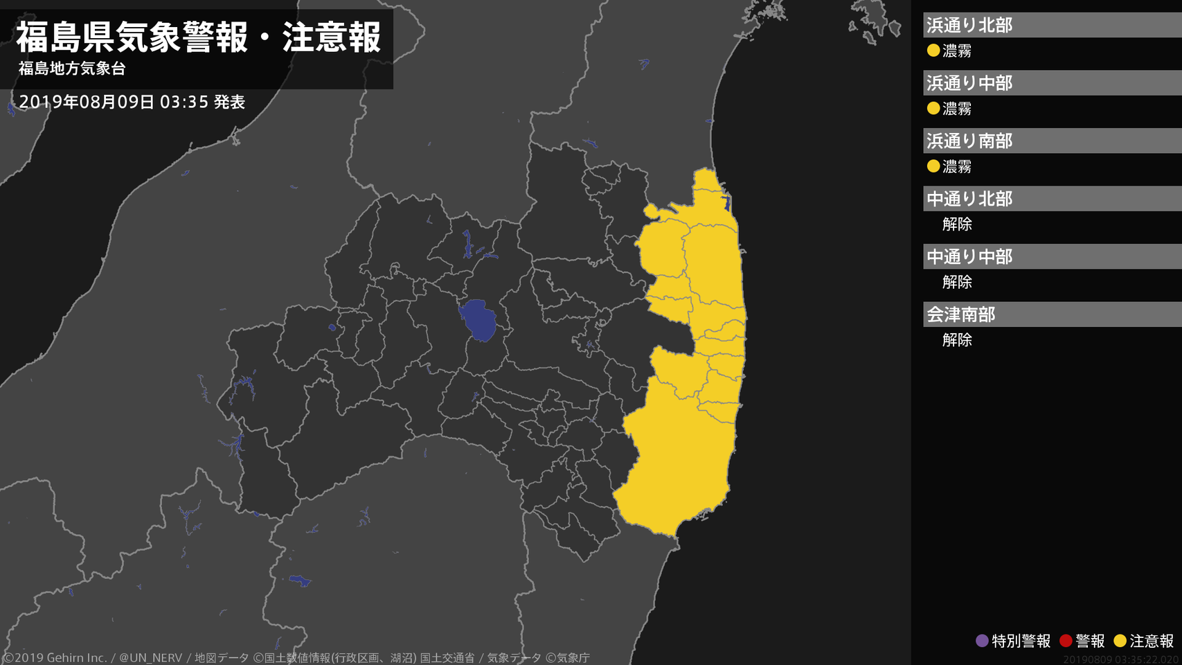 【福島県 気象警報・注意報 2019年08月09日 03:35】浜通りでは、9日昼前まで濃霧による視程障害に注意してください。#気象警報注意報 #福島県