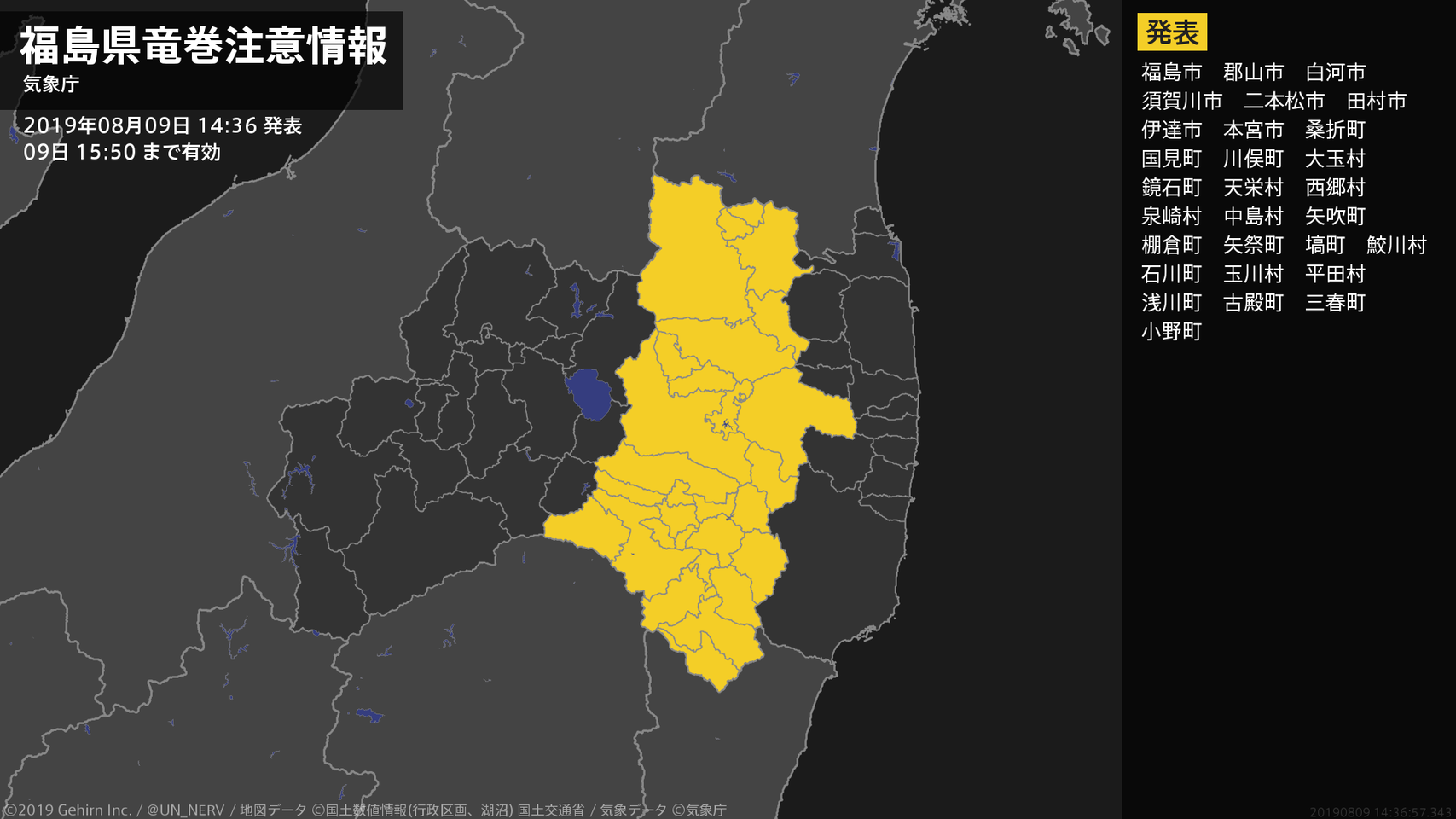 【福島県 気象警報・注意報 2019年08月08日 19:53】福島県では、8日夜遅くまで土砂災害や竜巻などの激しい突風、落雷に注意してください。浜通りでは、9日昼前まで濃霧による視程障害に注意してください。#気象警報注意報 #福島県