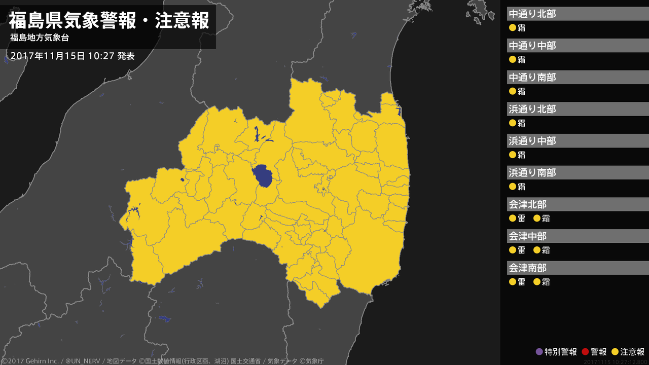 【福島県 気象警報・注意報 2017年11月15日 10:27】会津では、15日夕方から16日朝まで急な強い雨や落雷に注意してください。福島県では、16日朝は霜に対する農作物の管理に注意してください。#気象警報注意報 #福島県