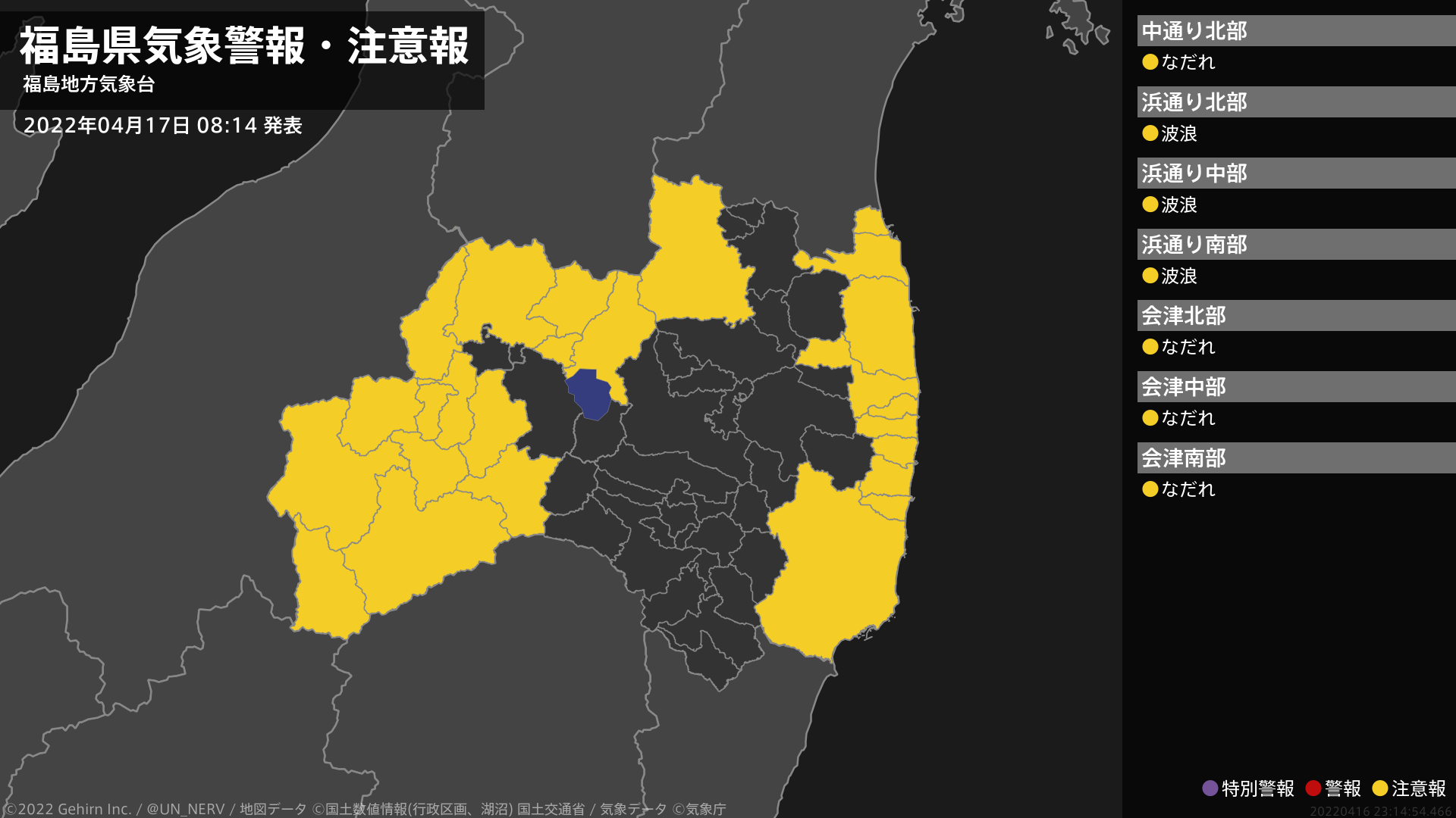 【福島県 気象警報・注意報 2022年04月16日 04:09】浜通りでは、強風や高波に注意してください。中通り、会津では、なだれに注意してください。#気象警報注意報 #福島県