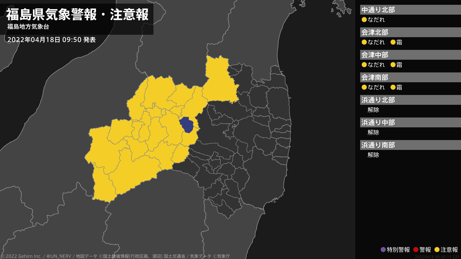 【福島県 気象警報・注意報 2022年04月18日 09:50】中通り、会津では、ここしばらくなだれに注意してください。会津では、19日朝は霜に対する農作物の管理に注意してください。#気象警報注意報 #福島県