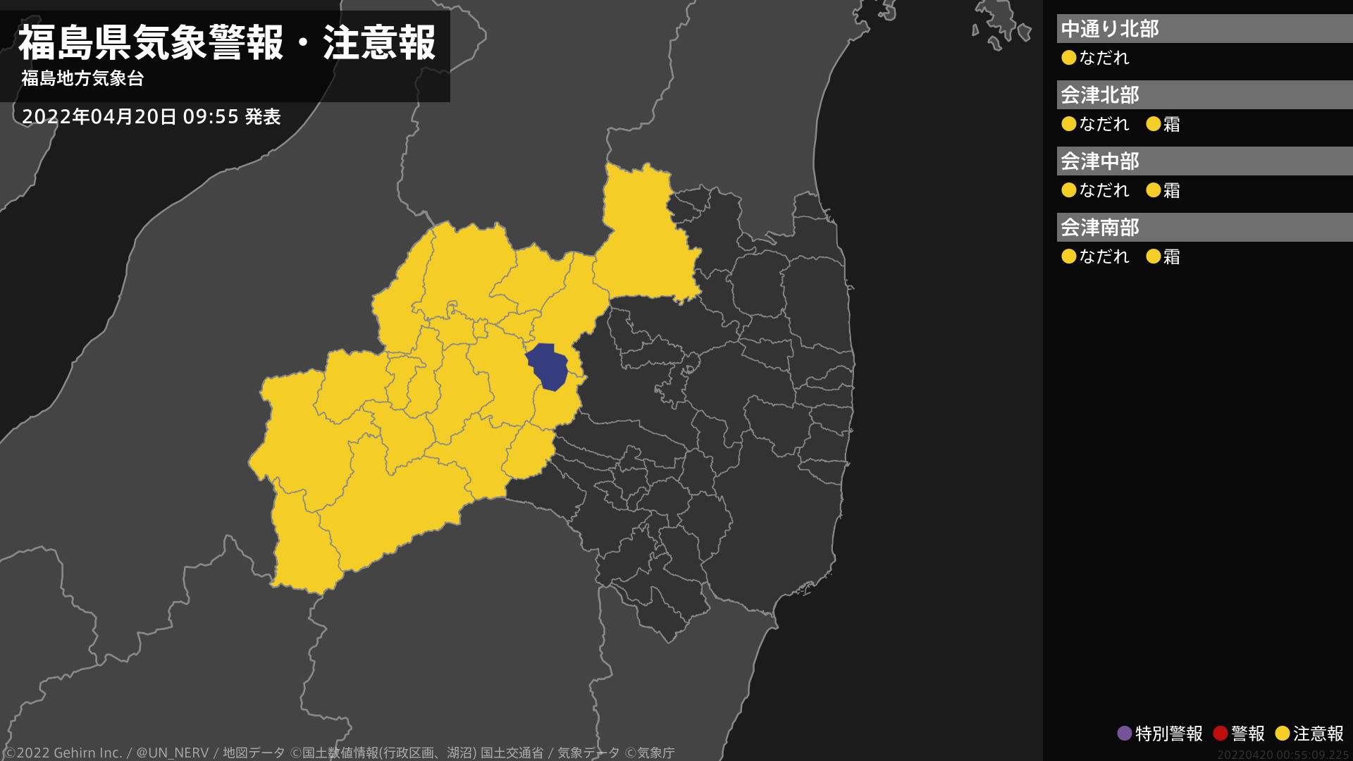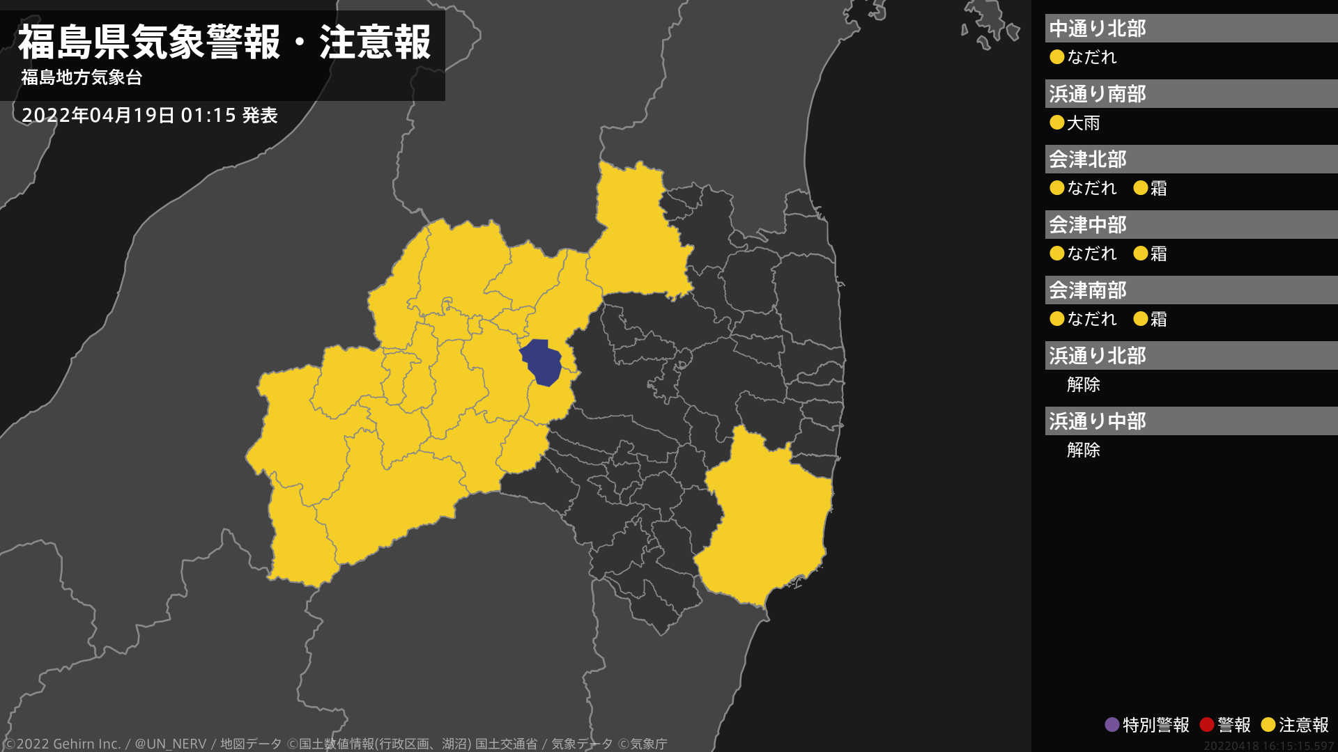 【福島県 気象警報・注意報 2022年04月19日 01:15】浜通りでは、19日明け方まで土砂災害に注意してください。中通り、会津では、ここしばらくなだれに注意してください。会津では、19日朝は霜に対する農作物の管理に注意してください。#気象警報注意報 #福島県
