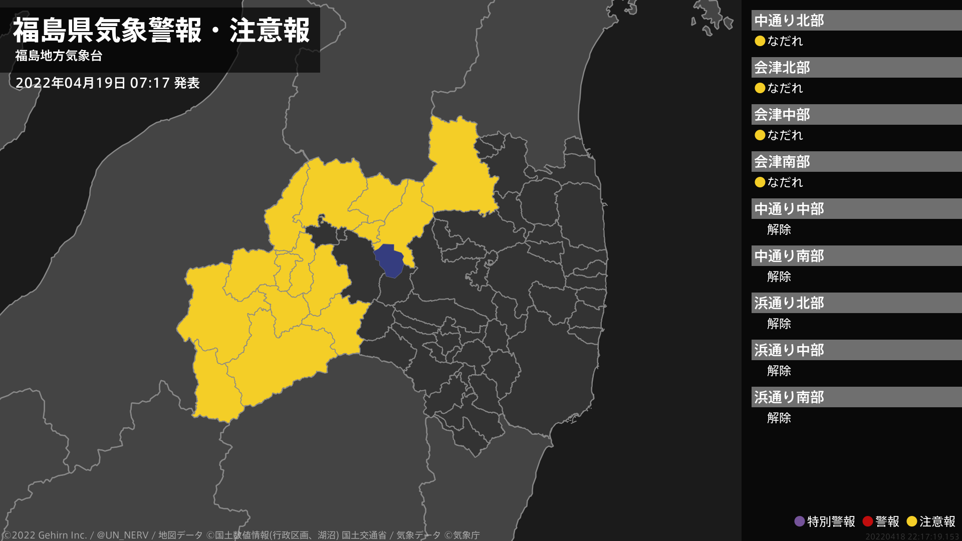 【福島県 気象警報・注意報 2022年04月19日 07:17】中通り、会津では、ここしばらくなだれに注意してください。#気象警報注意報 #福島県