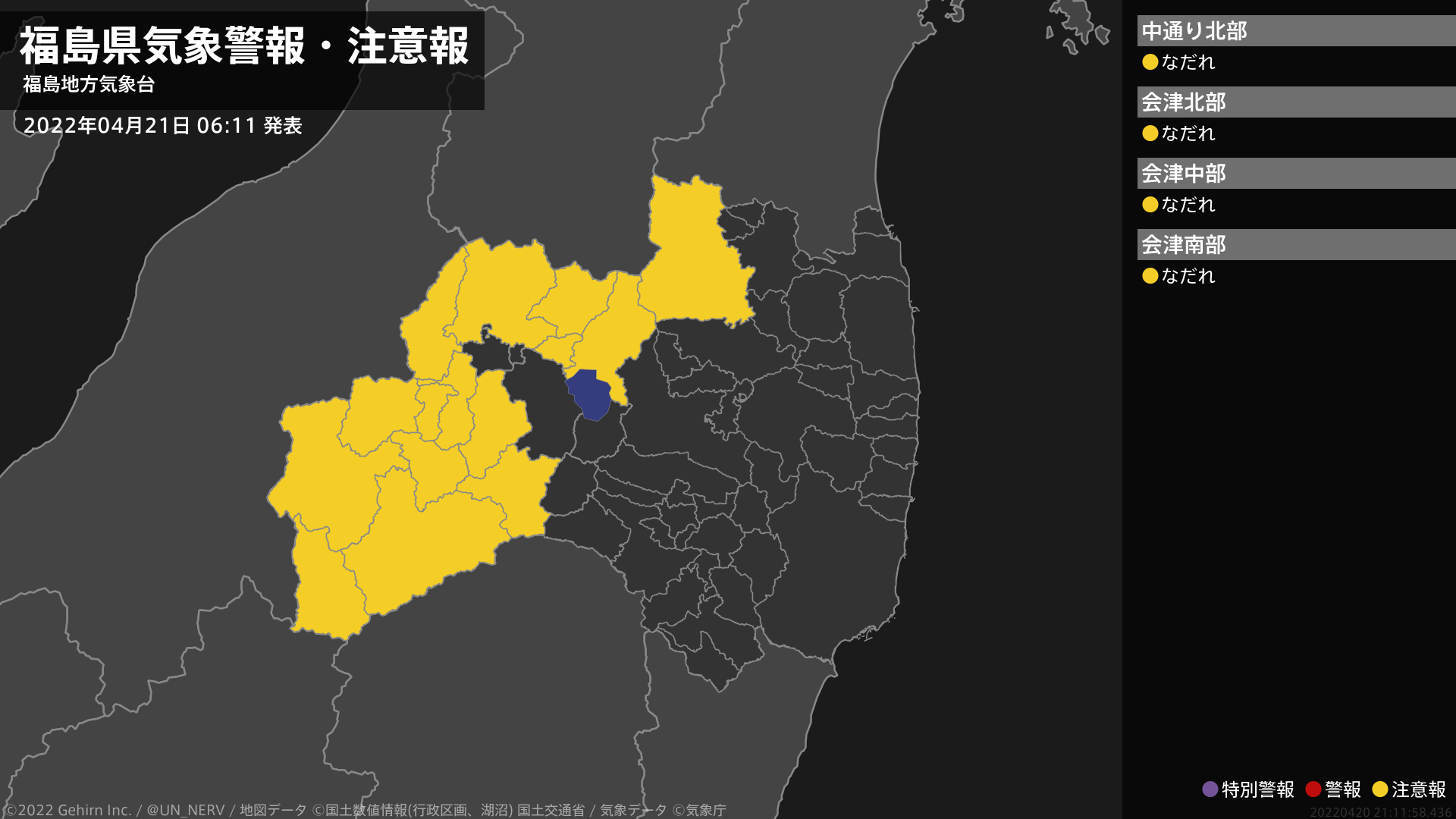 【福島県 気象警報・注意報 2022年04月21日 06:11】中通り、会津では、ここしばらくなだれに注意してください。#気象警報注意報 #福島県