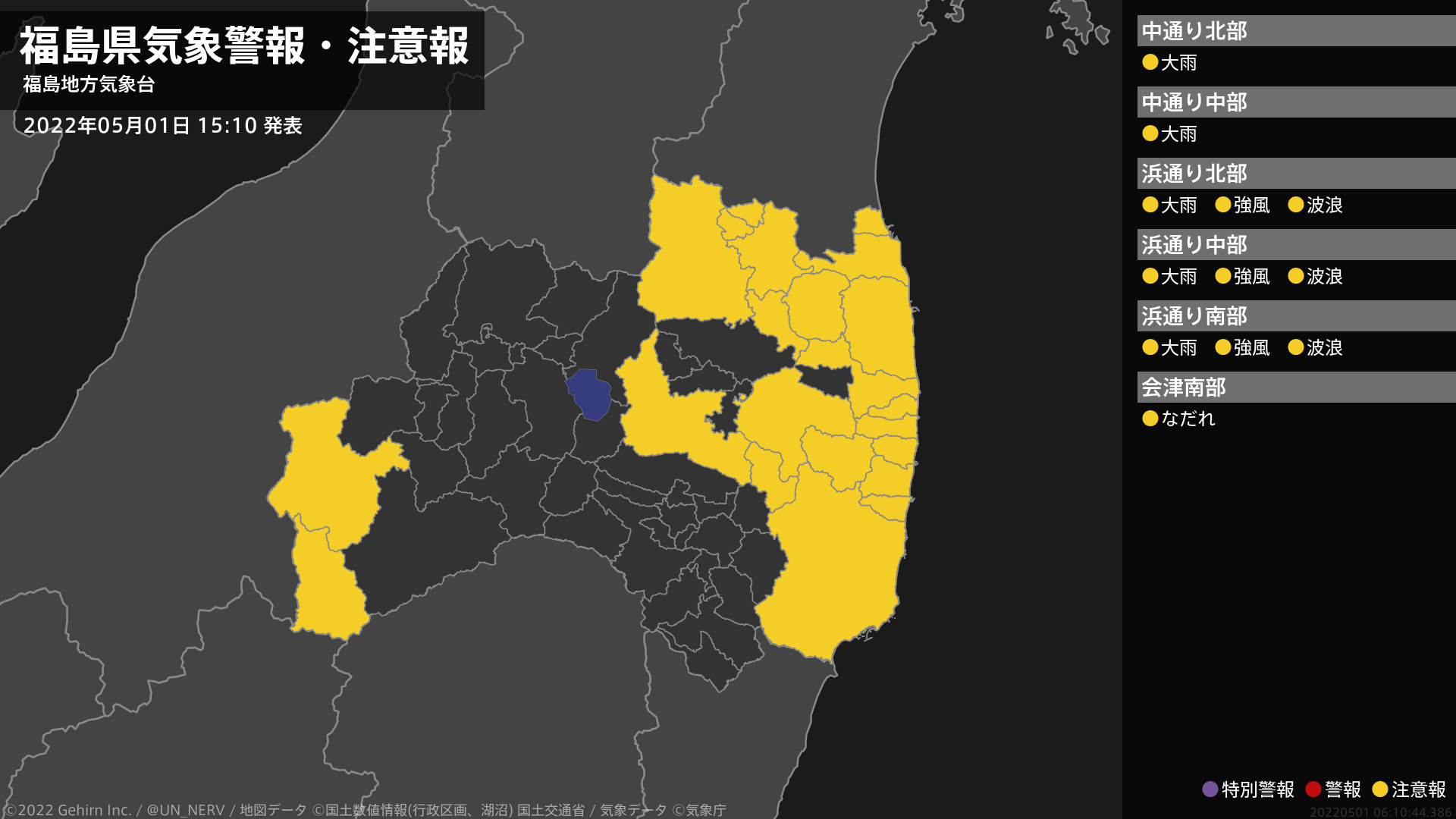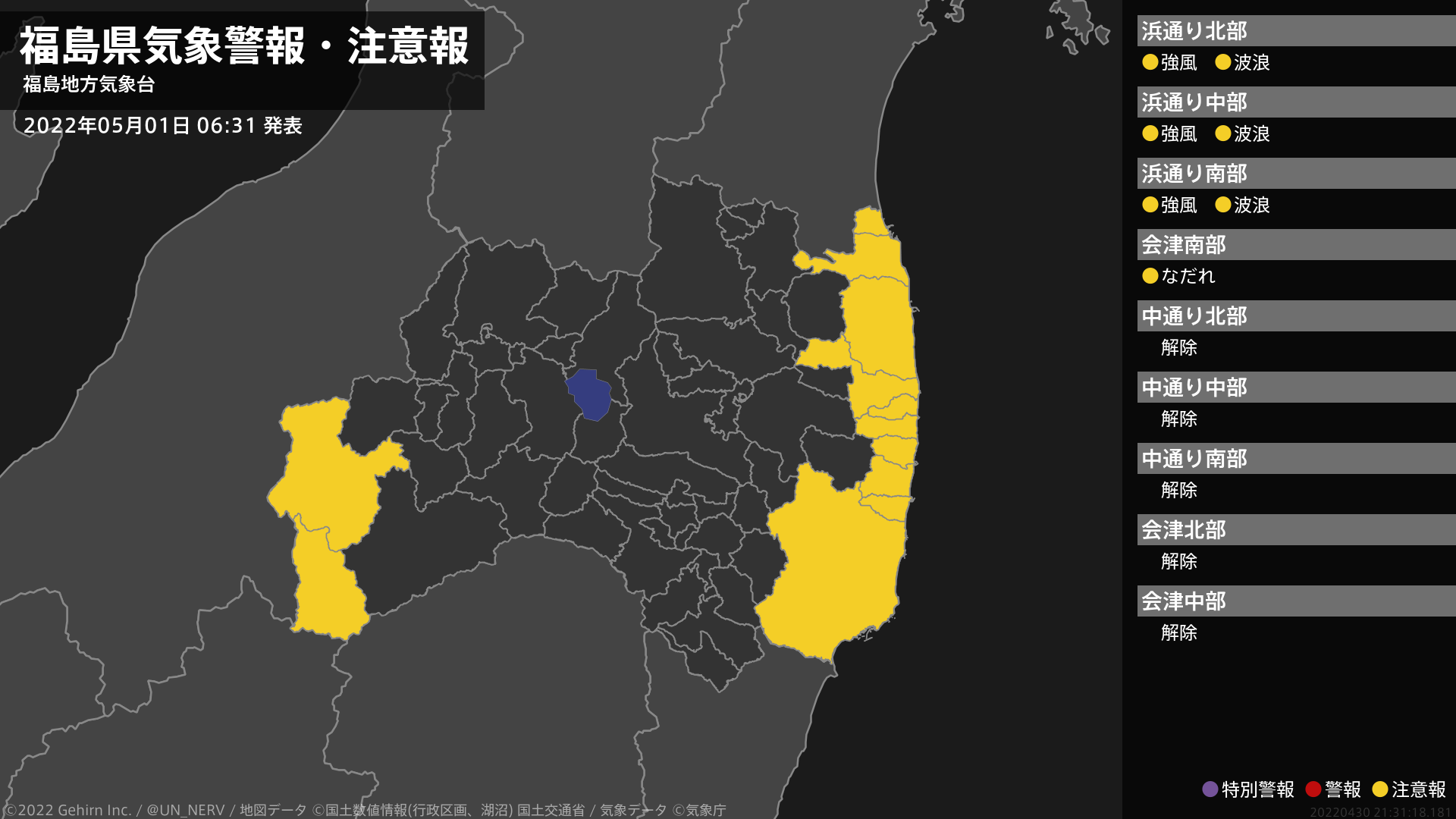 【福島県 気象警報・注意報 2022年05月01日 16:13】中通り、浜通りでは、土砂災害に注意してください。浜通りでは、強風や高波に注意してください。福島県では、濃霧による視程障害に注意してください。会津では、なだれに注意してください。#気象警報注意報 #福島県