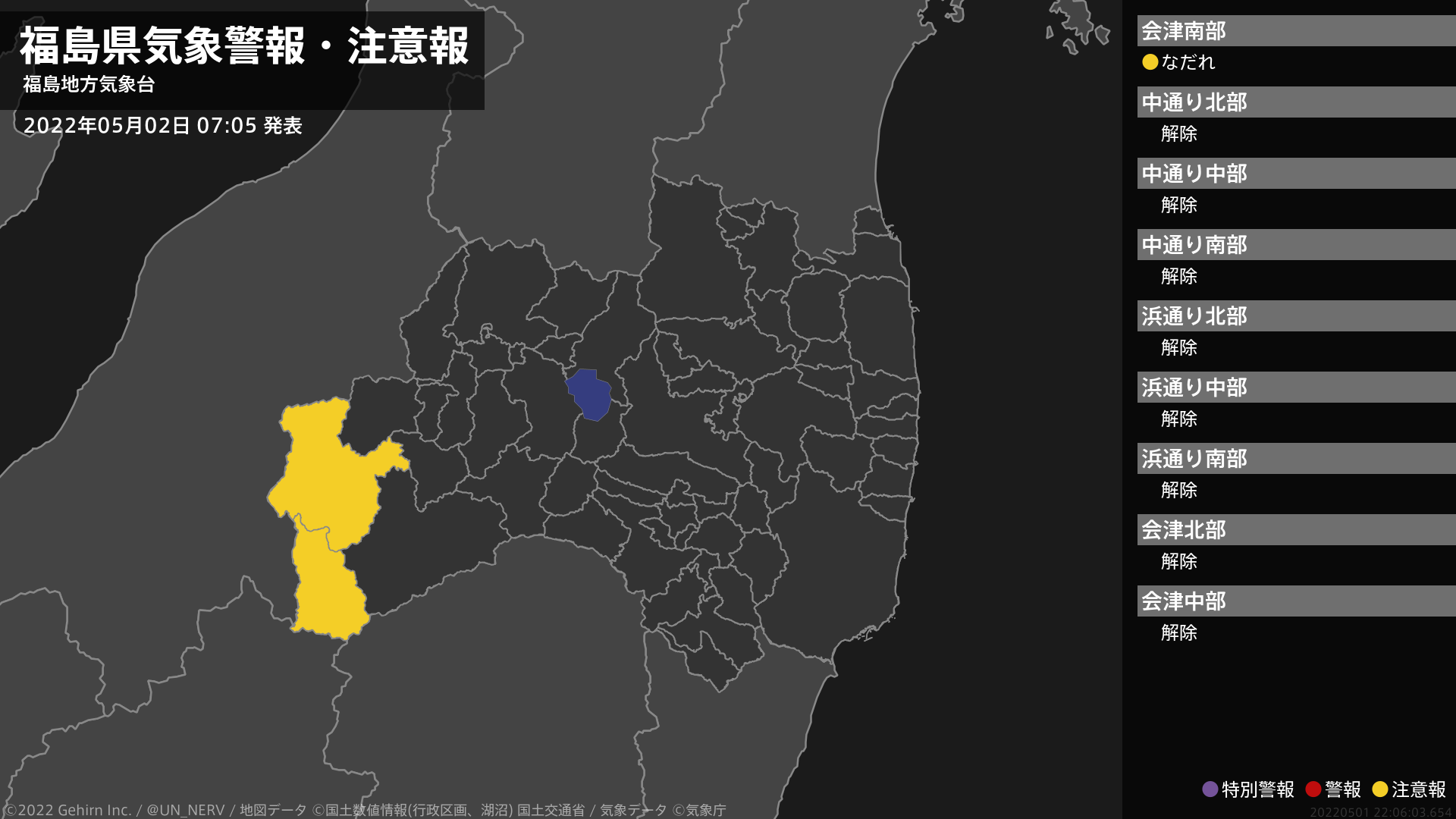 【福島県 気象警報・注意報 2022年05月02日 07:06】会津では、ここしばらくなだれに注意してください。#気象警報注意報 #福島県