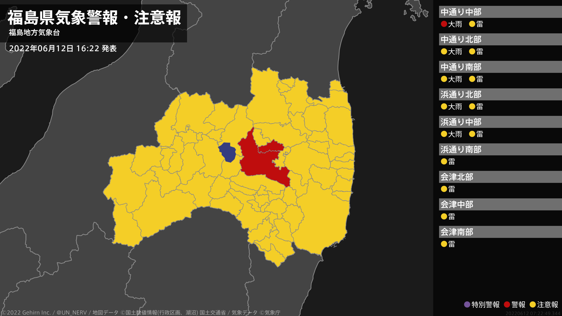 【福島県 気象警報 2022年06月12日 16:22】中通りでは、12日夜のはじめ頃まで土砂災害に警戒してください。#気象警報 #気象警報注意報 #福島県