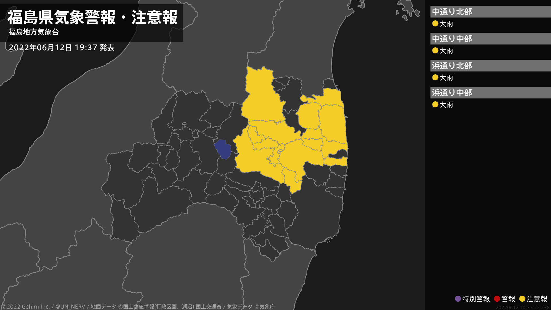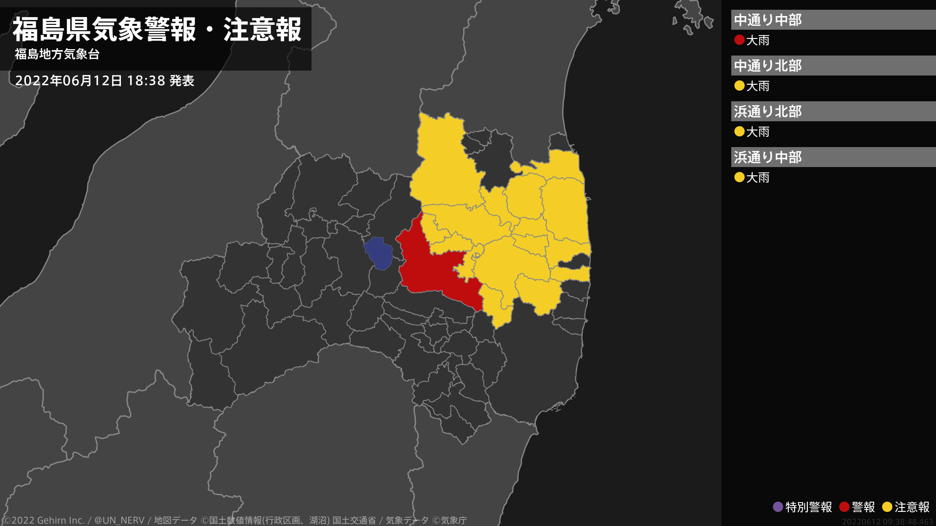 【福島県 気象警報 2022年06月12日 18:38】中通りでは、12日夜のはじめ頃まで土砂災害に警戒してください。#気象警報 #気象警報注意報 #福島県