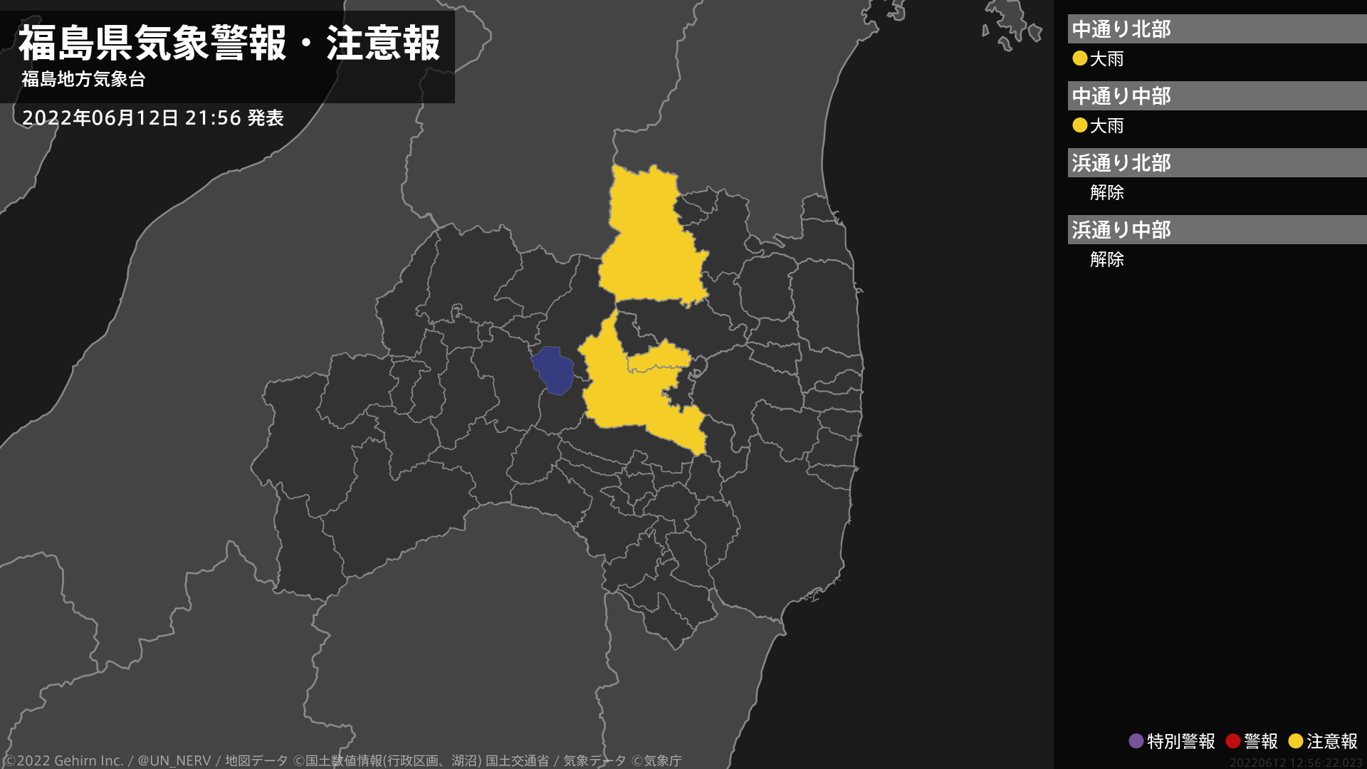 【福島県 気象警報・注意報 2022年06月12日 21:56】中通りでは、13日明け方まで土砂災害に注意してください。#気象警報注意報 #福島県