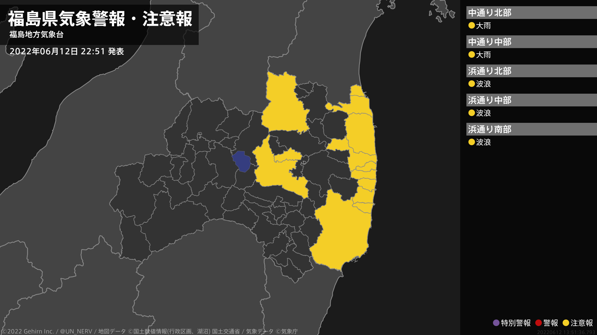 【福島県 気象警報・注意報 2022年06月12日 22:51】中通りでは、13日明け方まで土砂災害に注意してください。浜通りでは、13日明け方まで高波に注意してください。#気象警報注意報 #福島県