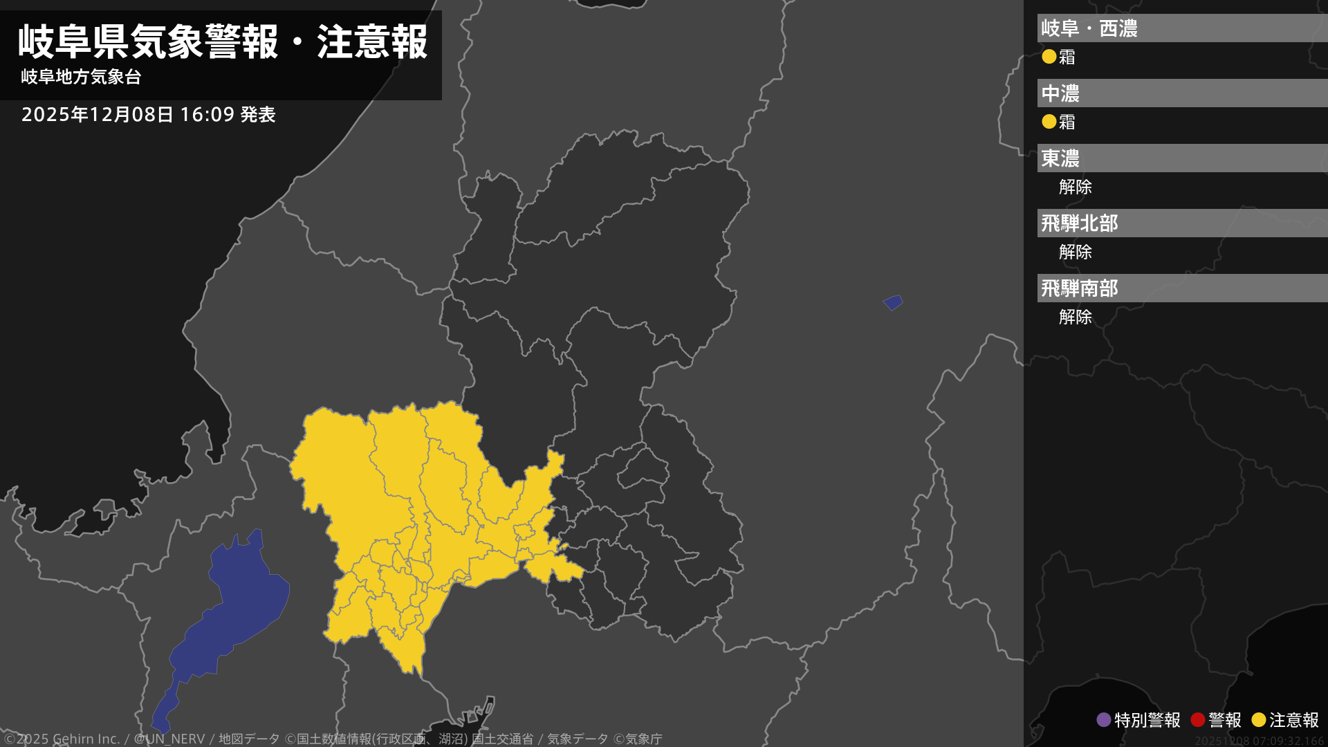 【岐阜県 気象警報・注意報 2025年12月09日 07:20】注意報を解除します。#気象警報注意報 #岐阜県