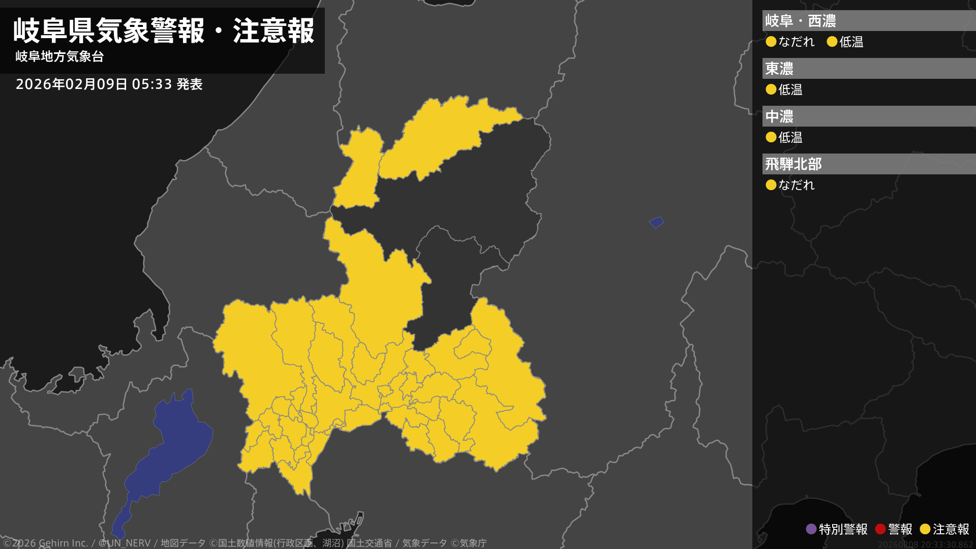 【岐阜県 気象警報・注意報 2026年02月09日 08:19】