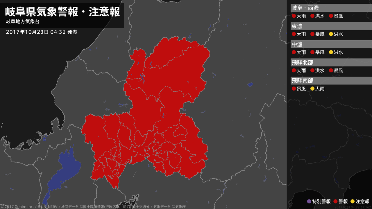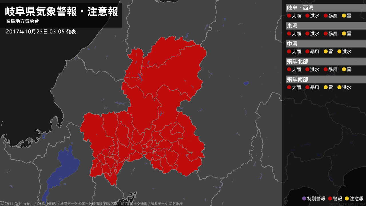 【岐阜県 気象警報・注意報 2017年10月23日 03:05】岐阜県では、土砂災害や河川の増水、暴風に警戒してください。#気象警報注意報 #岐阜県