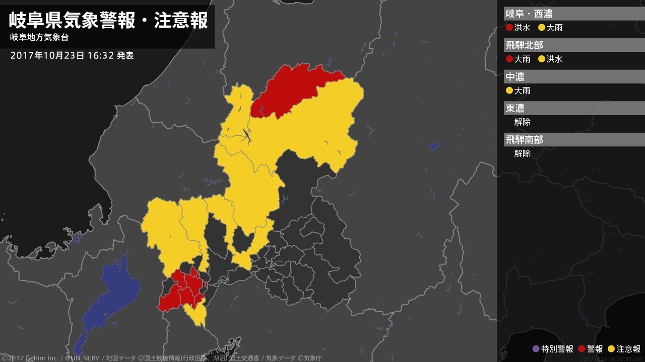 【岐阜県 気象警報 2017年10月23日 16:32】飛騨地方では、23日夜遅くまで土砂災害に警戒してください。美濃地方では、23日夜遅くまで河川の増水に警戒してください。#気象警報 #気象警報注意報 #岐阜県