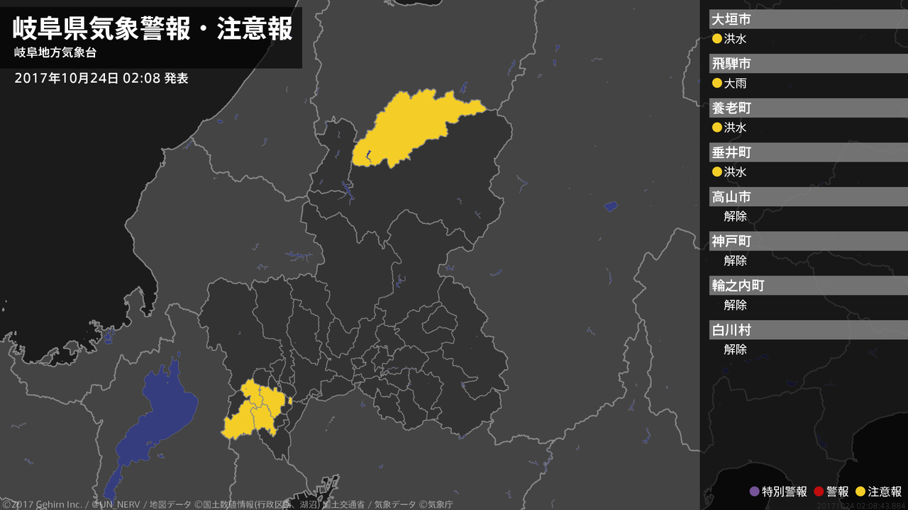 【岐阜県 気象警報(解除) 2017年10月24日 02:08】岐阜県に発表されていた気象警報はすべて解除されました。#気象警報 #岐阜県