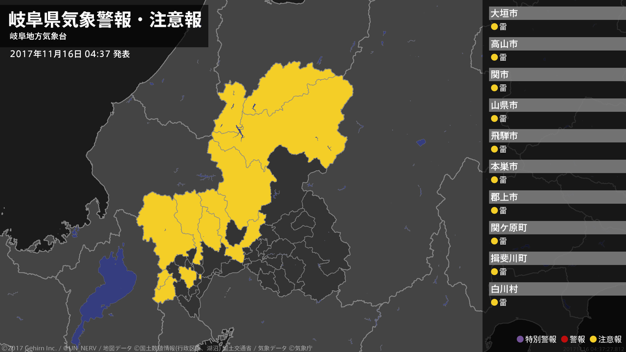 【岐阜県 気象警報・注意報 2017年11月16日 04:37】