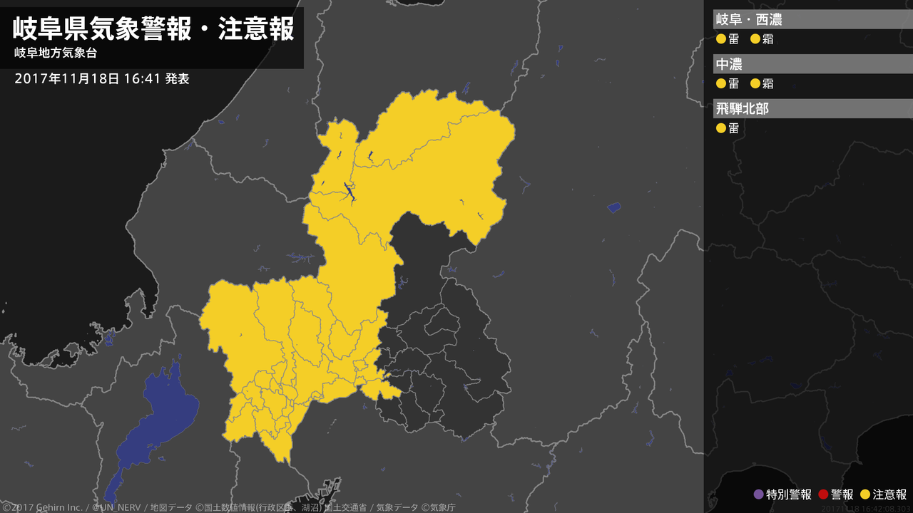 【岐阜県 気象警報・注意報 2017年11月18日 16:42】