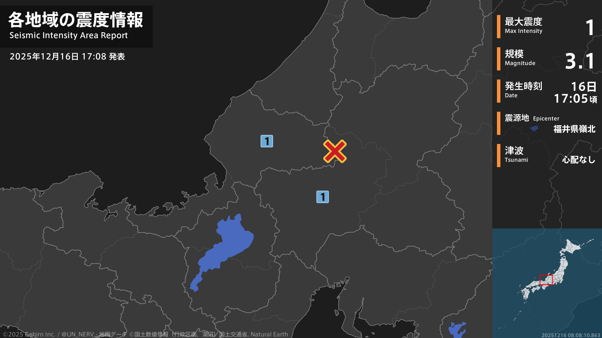 17時5分頃、福井県嶺北を震源とする地震がありました。震源の深さは約10km、地震の規模はM3.1、最大震度1を福井県、岐阜県で観測しています。この地震による津波の心配はありません。