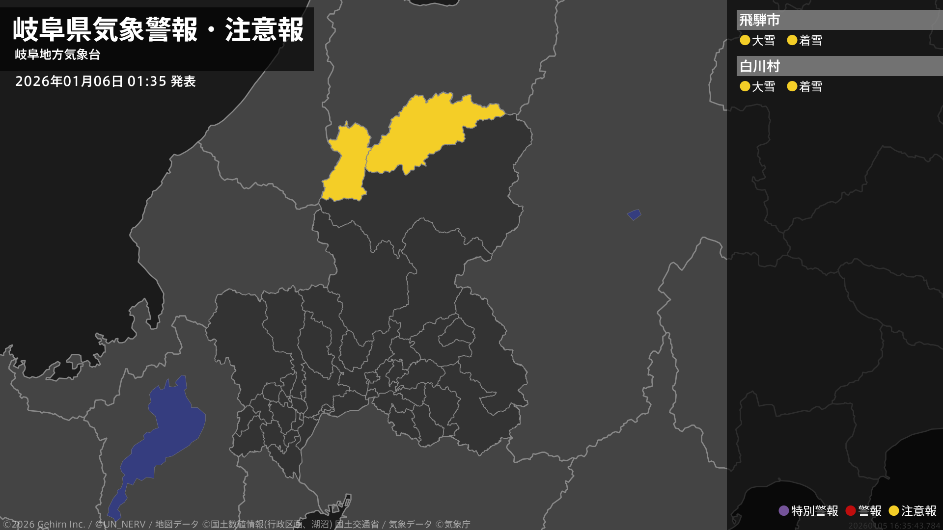 【岐阜県 気象警報・注意報 2026年01月06日 01:35】飛騨地方では、6日朝まで大雪や電線等への着雪に注意してください。#気象警報注意報 #岐阜県