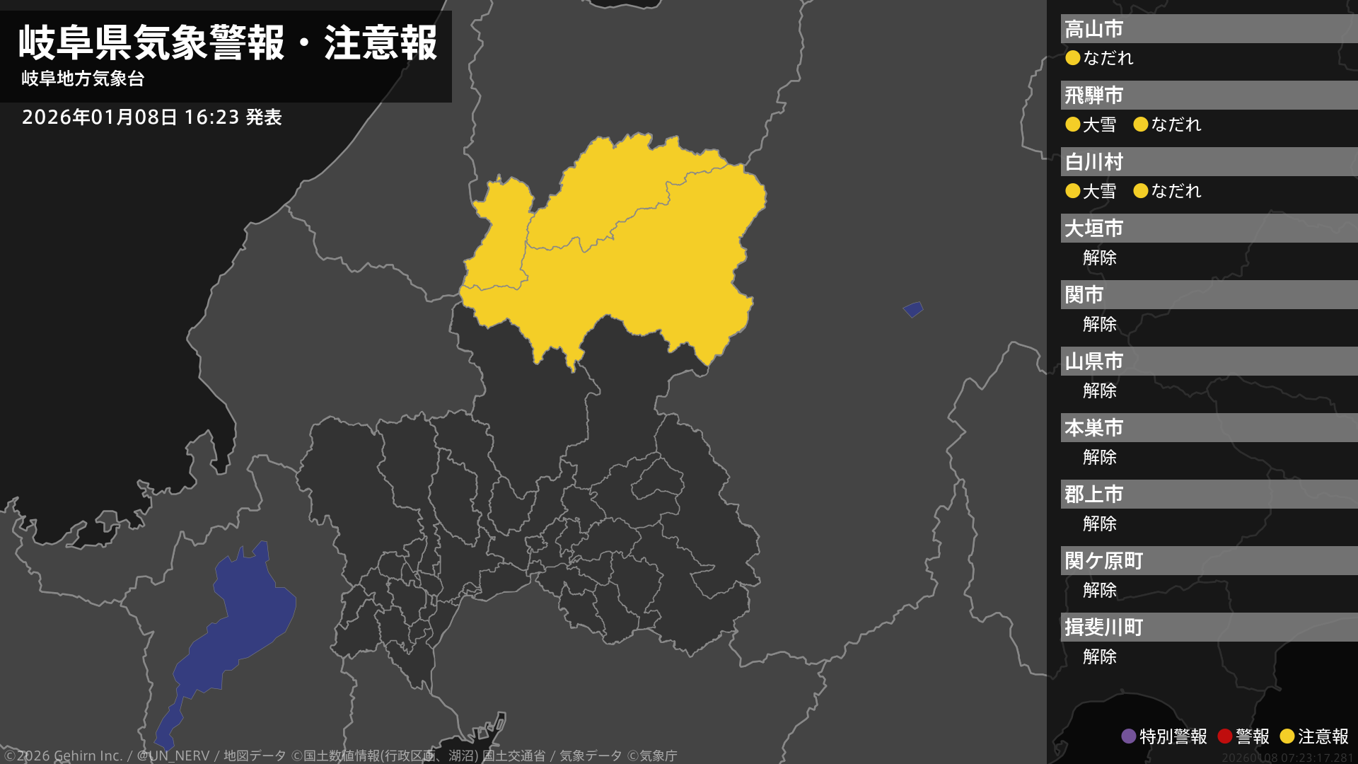 【岐阜県 気象警報・注意報 2026年01月08日 16:23】飛騨地方では、8日夜のはじめ頃まで大雪に、10日までなだれに注意してください。#気象警報注意報 #岐阜県