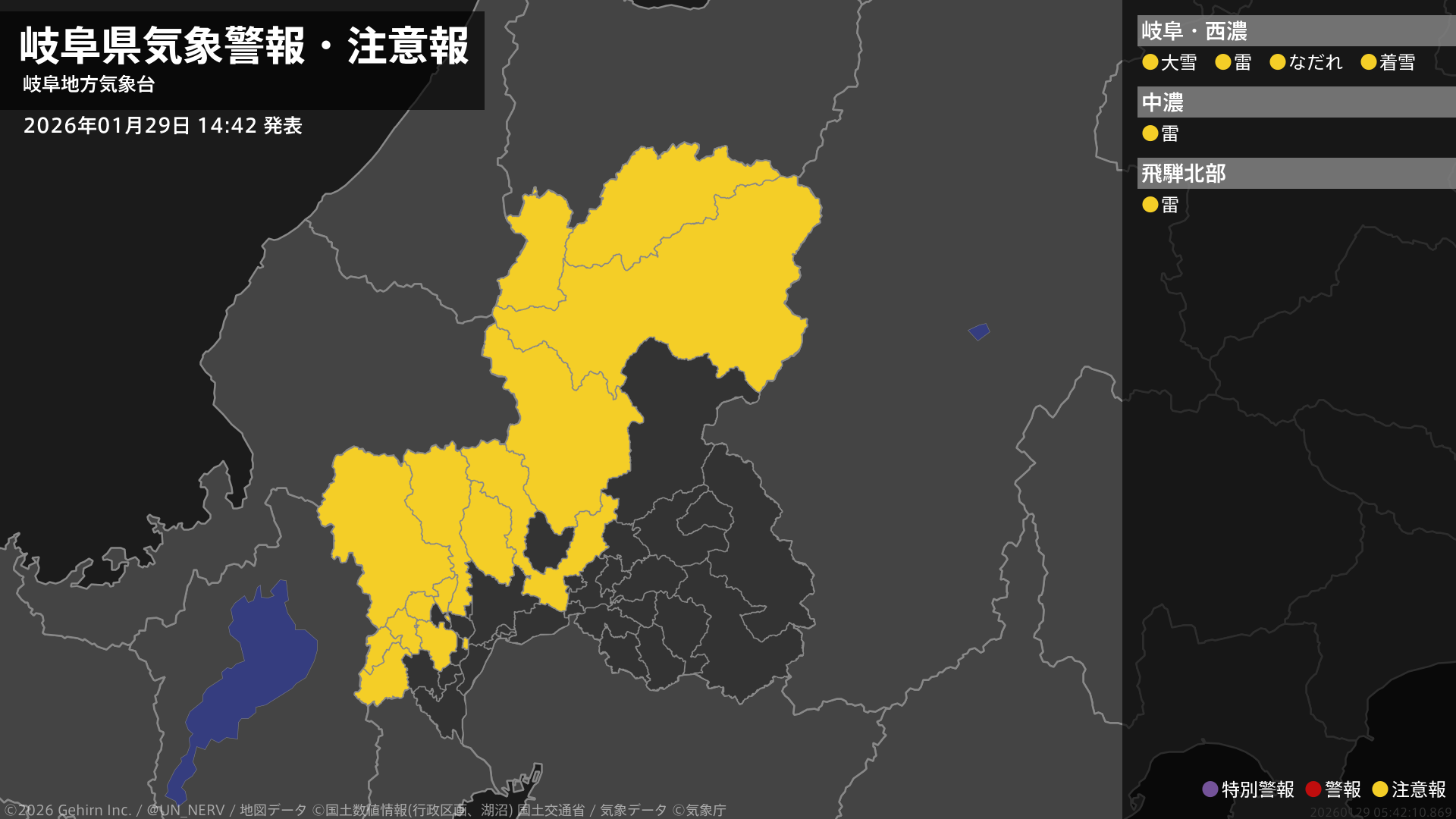【岐阜県 気象警報・注意報 2026年01月29日 14:42】美濃地方では、29日夜のはじめ頃から30日明け方まで大雪や電線等への着雪に、31日までなだれに注意してください。岐阜県では、29日夕方から30日明け方まで落雷に注意してください。#気象警報注意報 #岐阜県