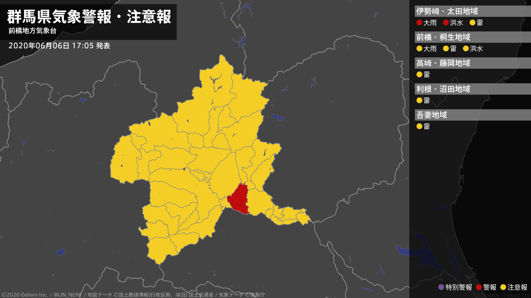 【群馬県 気象警報・注意報 2020年06月06日 17:06】