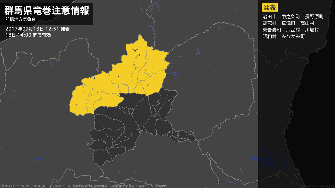 群馬県は、竜巻などの激しい突風が発生しやすい気象状況になっています。頑丈な建物内に移動するなど安全確保に努めてください。この情報は18日07:10まで有効です。