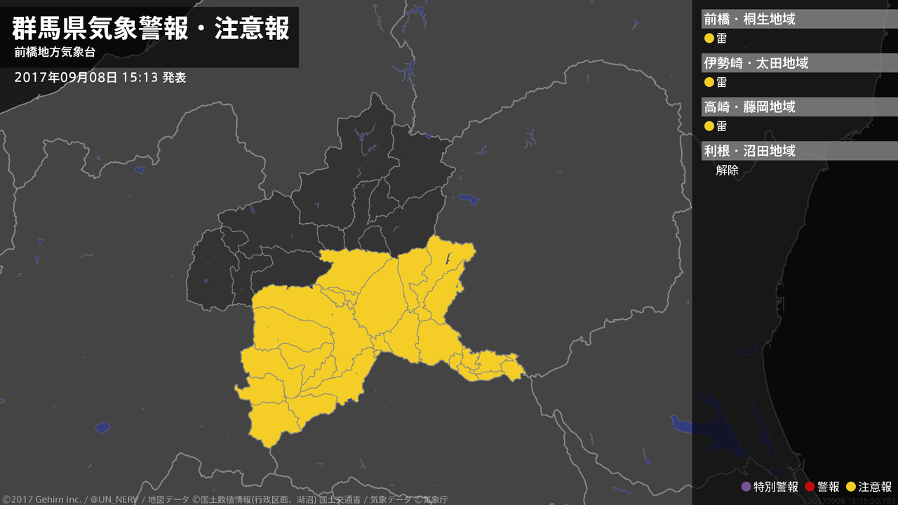 【群馬県 気象警報・注意報 2017年09月08日 15:15】