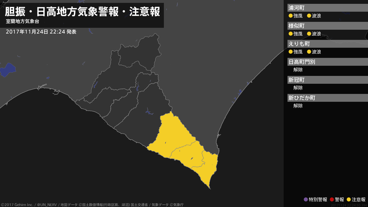 【胆振・日高地方 気象警報・注意報 2017年11月24日 22:24】日高地方では、25日夜遅くまで強風や高波に注意してください。#気象警報注意報 #日高地方