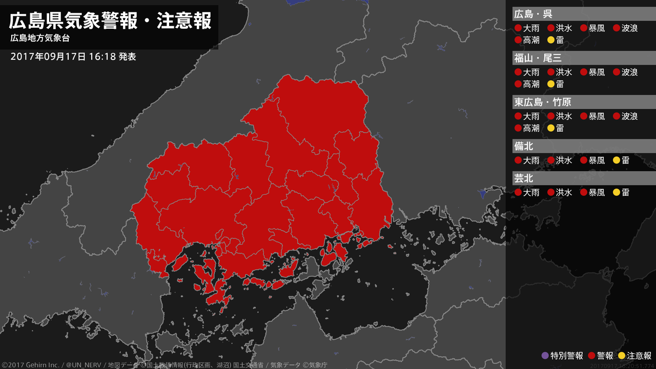 【広島県 気象警報・注意報 2017年09月16日 16:06】