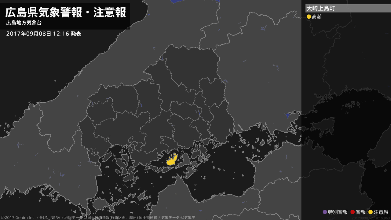 【広島県 気象警報・注意報 2017年09月08日 04:09】南部では、8日昼前は高潮に注意してください。#気象警報注意報 #広島県