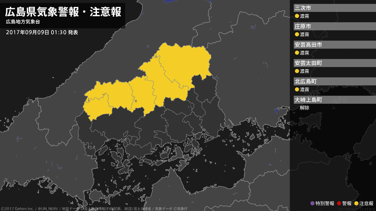 【広島県 気象警報・注意報 2017年09月09日 01:32】北部では、9日昼前まで濃霧による視程障害に注意してください。#気象警報注意報 #広島県