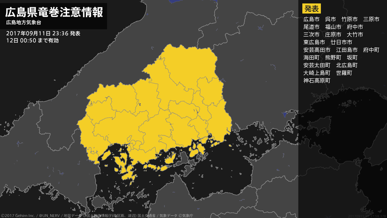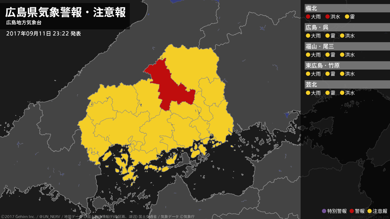 【広島県 気象警報 2017年09月11日 23:24】北部では、12日明け方まで土砂災害や河川の増水に警戒してください。#気象警報 #気象警報注意報 #広島県