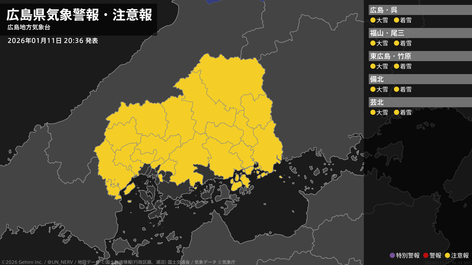 【広島県 気象警報・注意報 2026年01月11日 20:36】広島県では、12日明け方まで大雪や電線等への着雪に注意してください。#気象警報注意報 #広島県