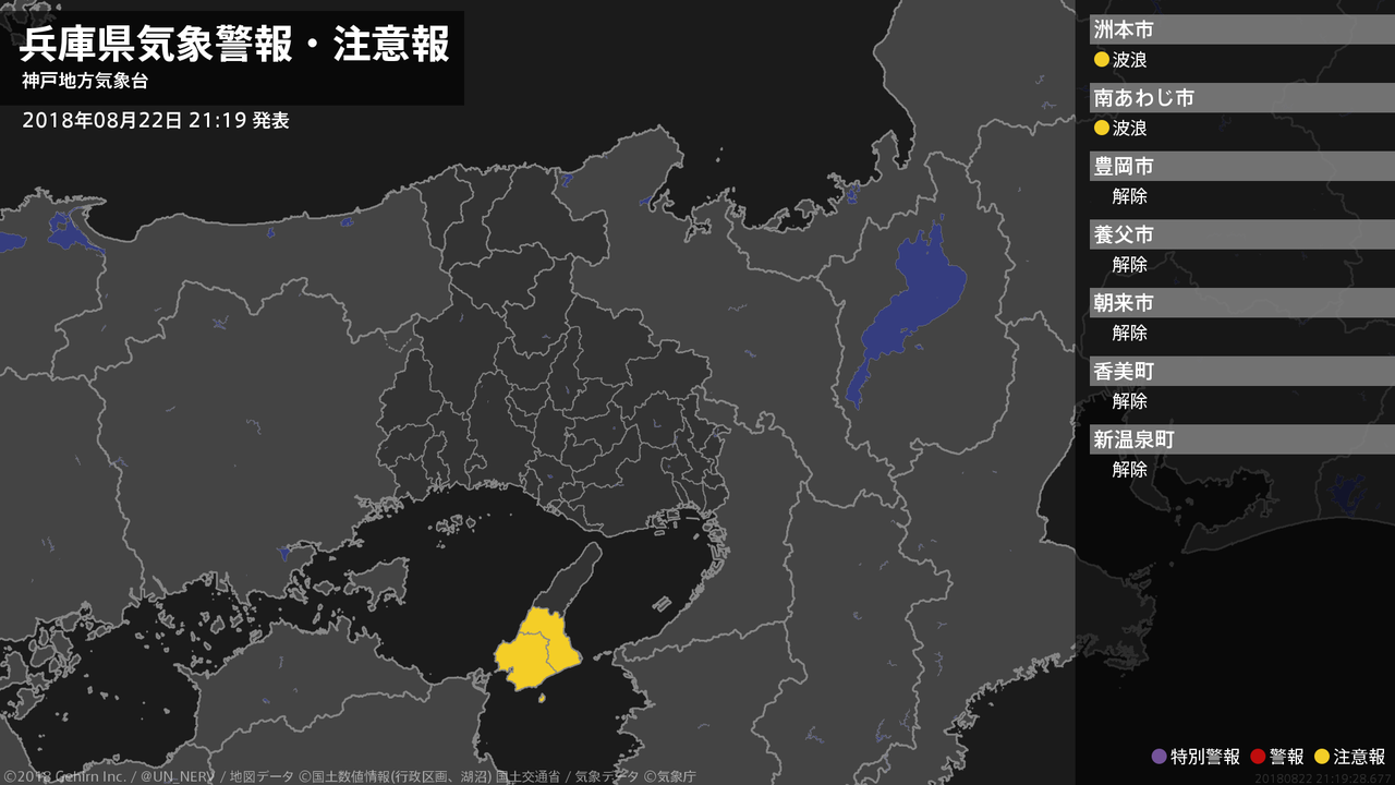 【兵庫県 気象警報・注意報 2018年08月22日 21:19】南部では、高波に注意してください。#気象警報注意報 #兵庫県