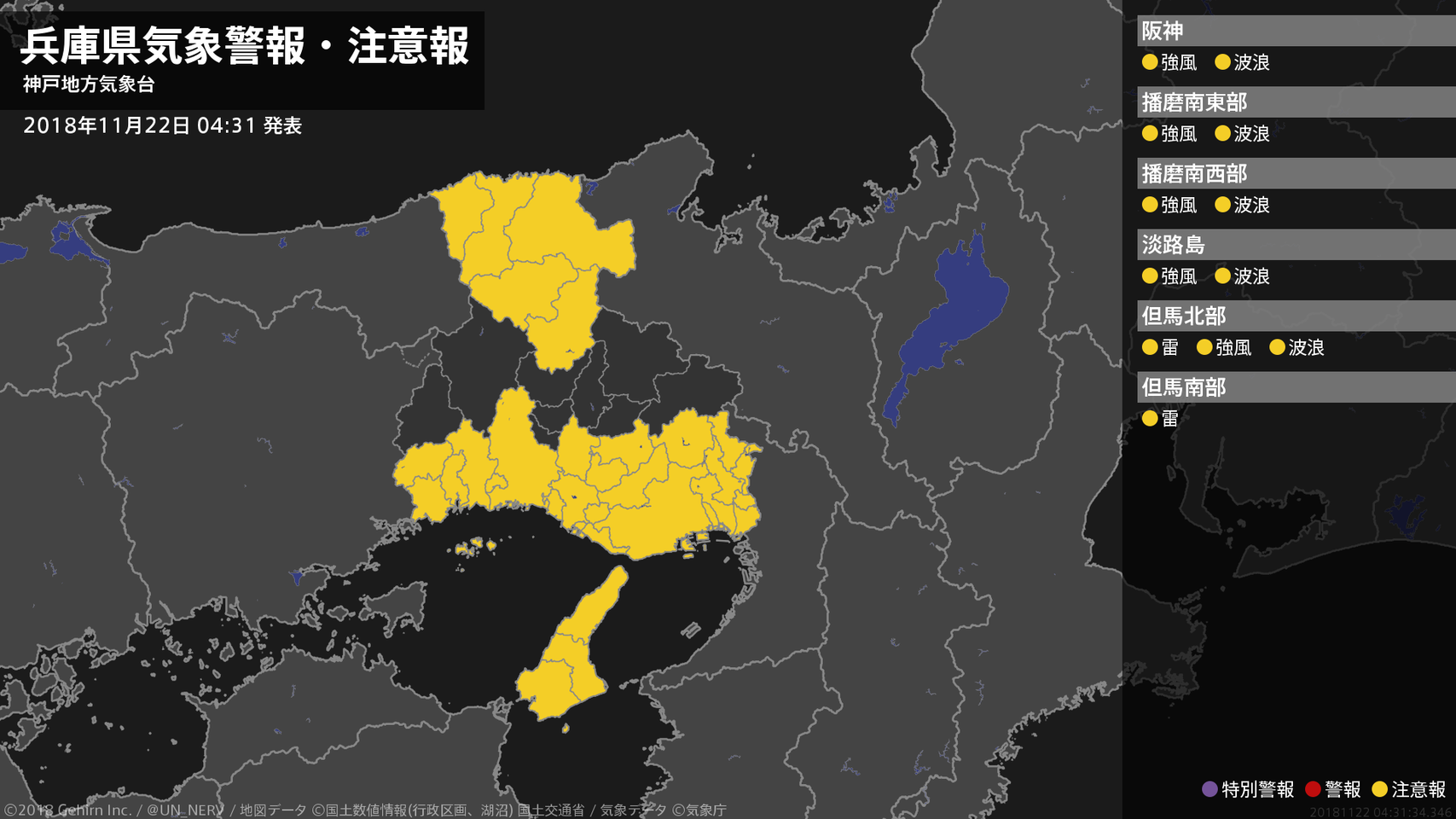 【兵庫県 気象警報・注意報 2018年11月22日 04:31】兵庫県では、強風や高波に注意してください。北部では、急な強い雨や落雷に注意してください。#気象警報注意報 #兵庫県