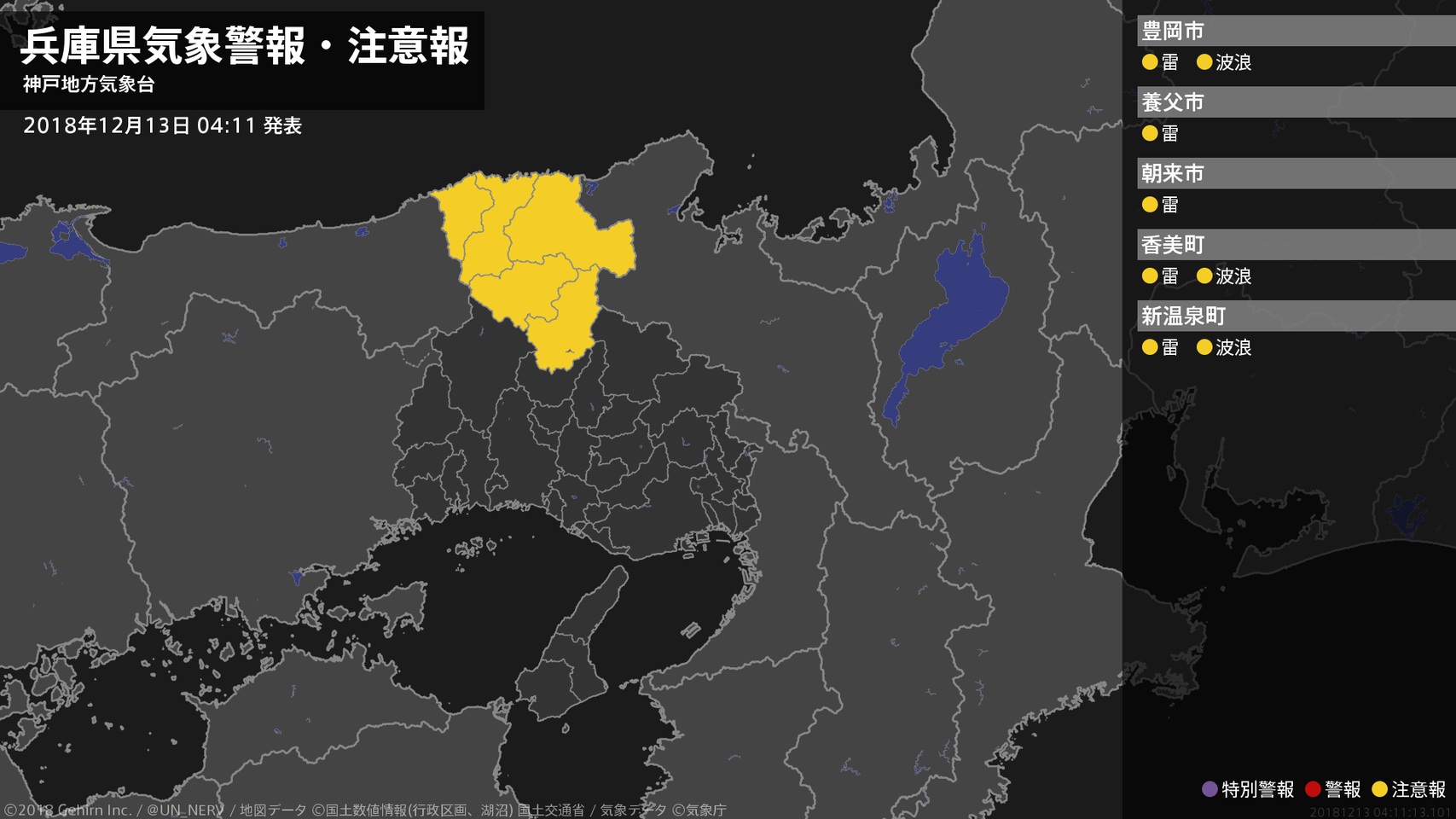 【兵庫県 気象警報・注意報 2018年12月13日 04:11】北部では、13日朝まで高波に、13日昼過ぎから14日明け方まで落雷に注意してください。#気象警報注意報 #兵庫県